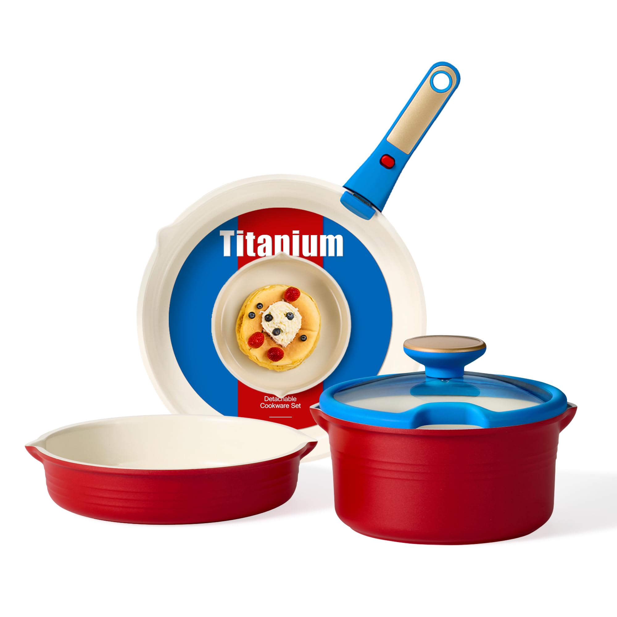 CAROTE 5Pcs Titanium Cookware Set, Pots and Pans Set Non Stick, Kitchen Cooking Set with Detachable Handle, Non Toxic Induction Cookware, Dishwasher/Oven Safe,Memphis Design