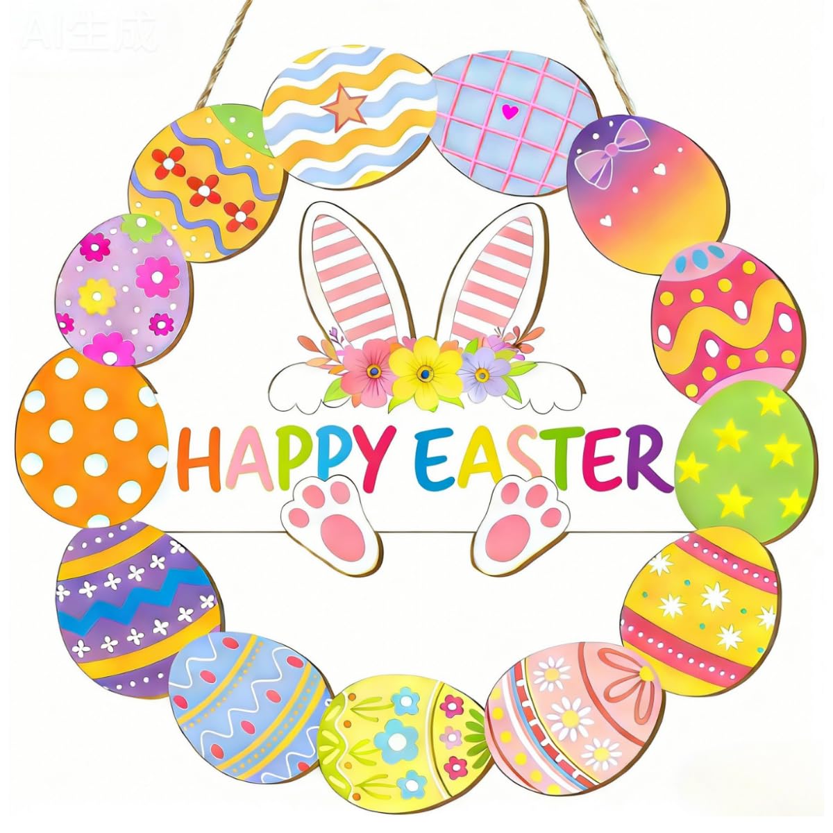 MAZUBOHOY Wooden Easter Door Sign for Front Door, Happy Easter Signs Bunny Egg Wreath Hanging Decoration for Home Wall Window Door Decor