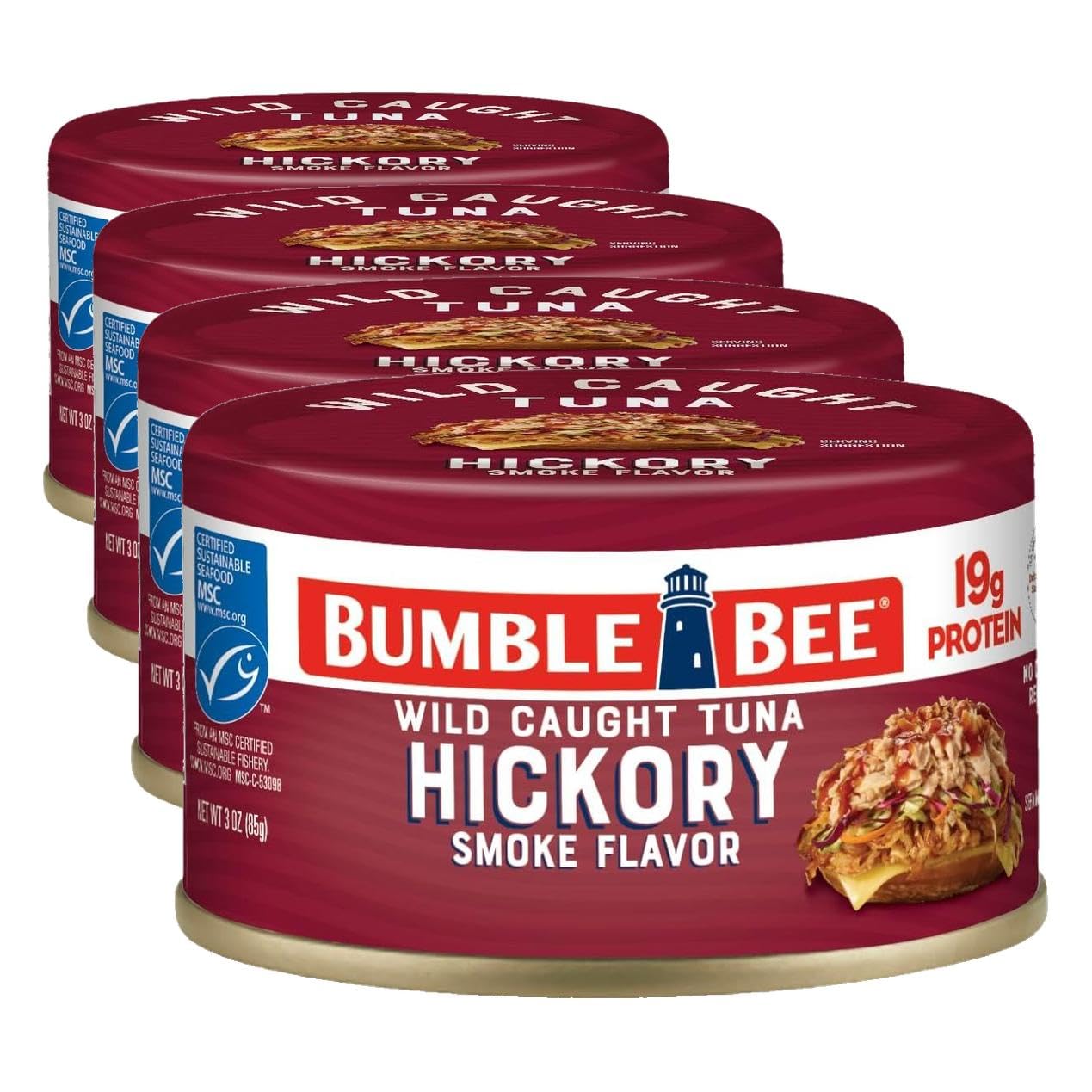 Great deal on Bumble Bee Snackers - Hickory Smoke Tuna, 3 oz Easy Open Can - 19g Protein per Serving - Wild Caught Skipjack Chunk Light Tuna Pack - No Draining, Ready to Eat (Pack of 4) at Amazon.