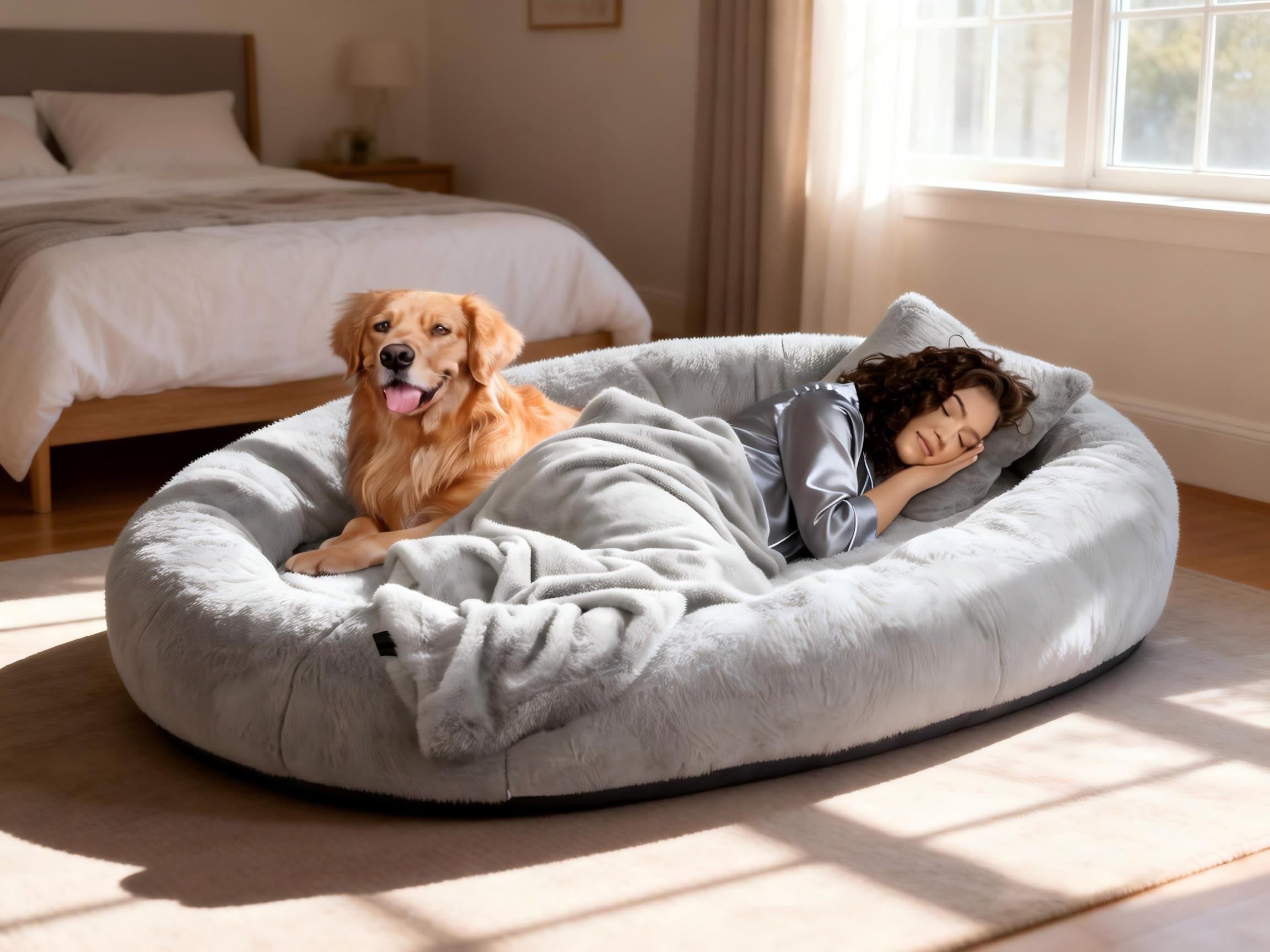 Elevon Human Dog Bed for Adults, 71"x47"x12" Large Size Dog Bed with Soft Blanket & Pillow, Comfort Washable Faux Fur Fluffy NEP Bed for People, Removable Memory Foam, Gray