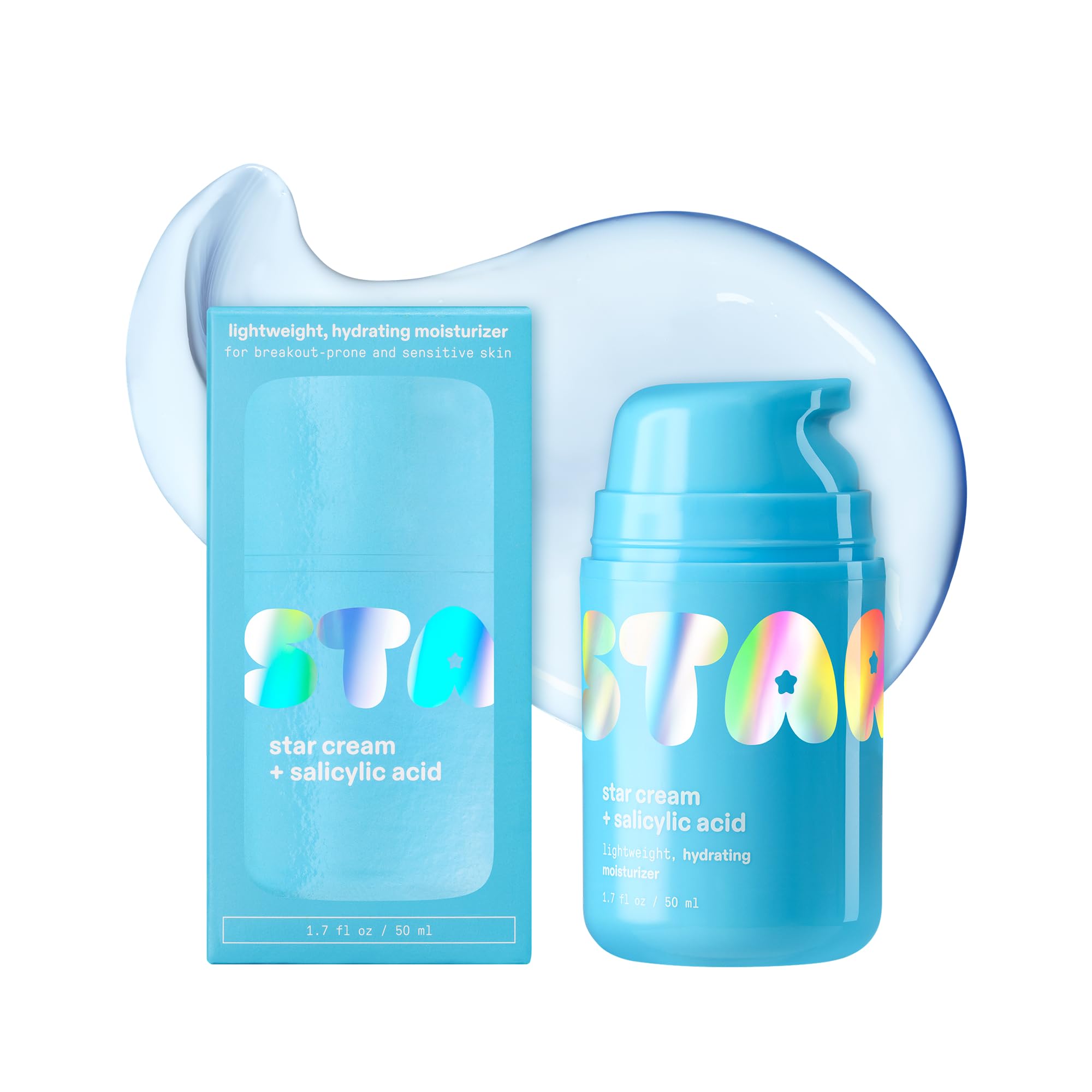 star cream + salicylic acid is an oil-free moisturizer that helps minimize breakouts and repair dryness for happy skin. the dreamiest combo of salicylic acid, hyaluronic acid, and niacinamide work together to unclog pores while locking in moisture. it's like a hug for your face, twice a day. star cream absorbs into skin like a cloud with a lightweight, silky feel. cool and comforting, star cream leaves skin with a fresh, dewy sheen