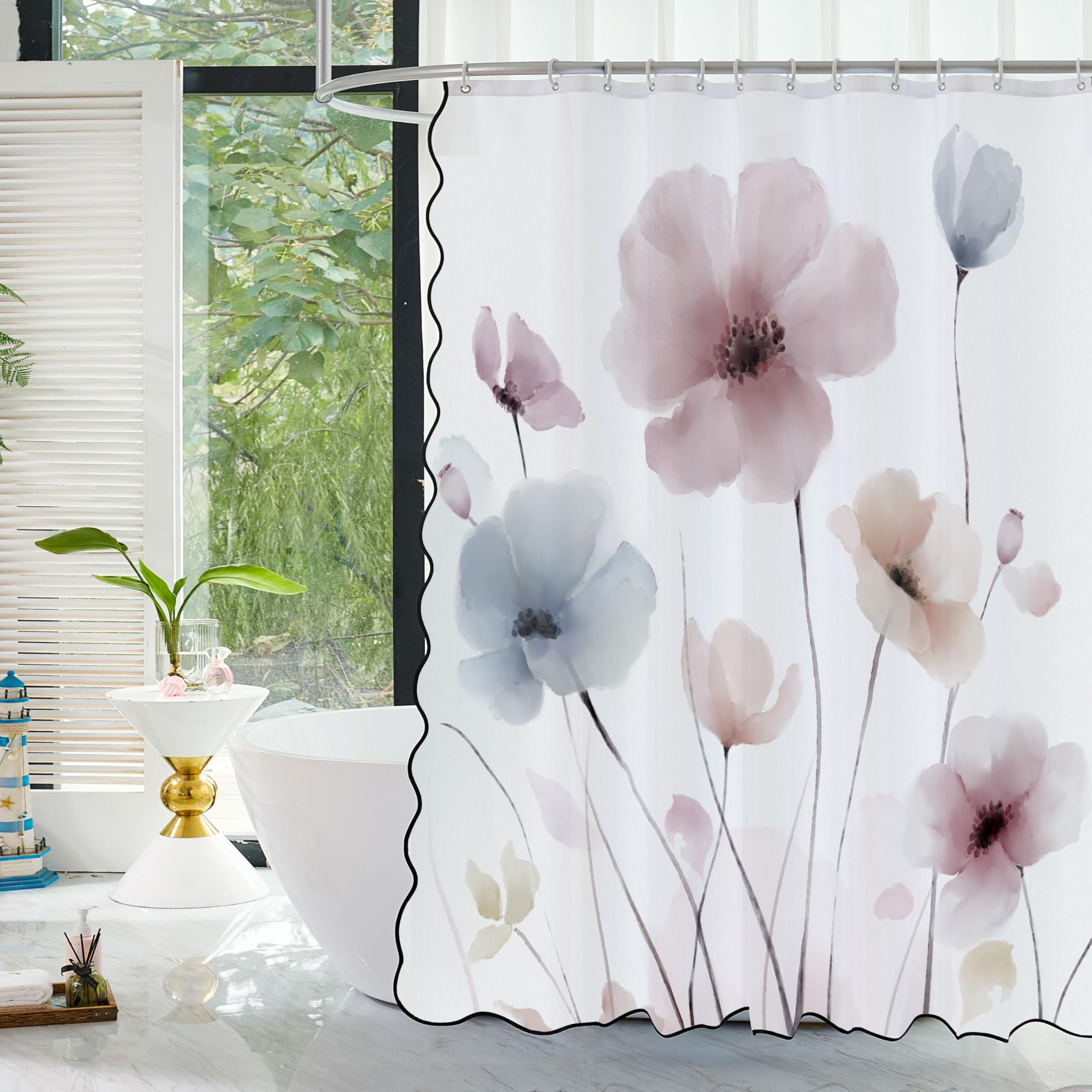 Mightree Pink Scalloped Shower Curtain with Floral Pattern for Bathroom, Waterproof Girly Ruffle Fbric Shower Curtain, 12 Hooks Included, Washable & Dry Quickly,71" H x71 W
