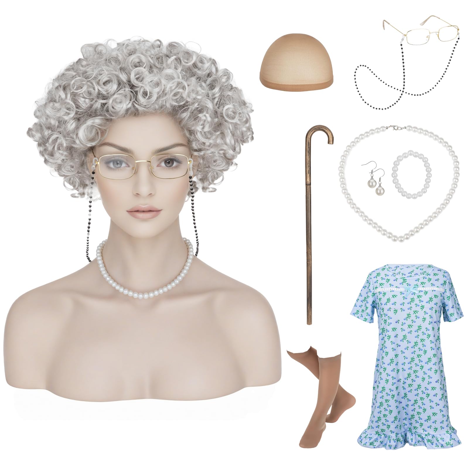 SEGOHAIR Old Lady Costume Set Style: Gray Bun, Dark Gray Wavy, Silver Curly Hat size: 21 inches - 24.5 inches Material: 100% heat-resistant synthetic fiber Occasion: Perfect for 100 Days of Costume, Daily Use, Gift Giving, Theme Party, Wedding, Dating, Role Playing, Costume, Disco Ball, Halloween Party, etc. Package includes: 1 x Granny Costume Nightgown 1 x Granny Wig 1 x Granny Glasses 1 x Eyeglass chains 1 x Gold Granny Cane 1 x Long Necklace 1 x Bracelet 1 x Earring 1 x Socks 1 x Wig Caps How to Wear 1.Comb your hair. 2.Tie your hair into a bun. 3.Put the wig cap on your head, push all the hair into the cap and fasten the cap. 4.Put the wig on your head, pull the adjustable straps to fit your head. 5.Fasten the straps and brush the wig again. How to wash 1.Use a special brush to comb the wig flat and wrap the wig with a net. Soak in water for 2-3 minutes. 2.Choose a two-in-one shampoo. Avoid rubbing hard, and hold your hair gently with your hands. 3.Rinse thoroughly with clean cold water and towel dry. Do not wring or dry clean. 4.Let them dry naturally, avoid drying in the sun. 5.If the hair is tangled after long-term use, use an oil-free conditioner. Tips 1.When combing the wig, be gentle and don't pull it hard. 2.We highly recommend choosing a wide-tooth comb for the best results! 3.Don't use gel water or hair wax on the wig. Use conditioner when it feels dry. 4.All synthetic fiber wigs have minimal shedding and tangling, which is normal. Please pay attention to cleaning and maintenance. 5.You can store the wig in a hair net or plastic bag, or in a wig stand. Store it in a cool and dry place. 6.Please note that the color may be a little difference to the photos because of your computer monitor's color setting or other reasons.