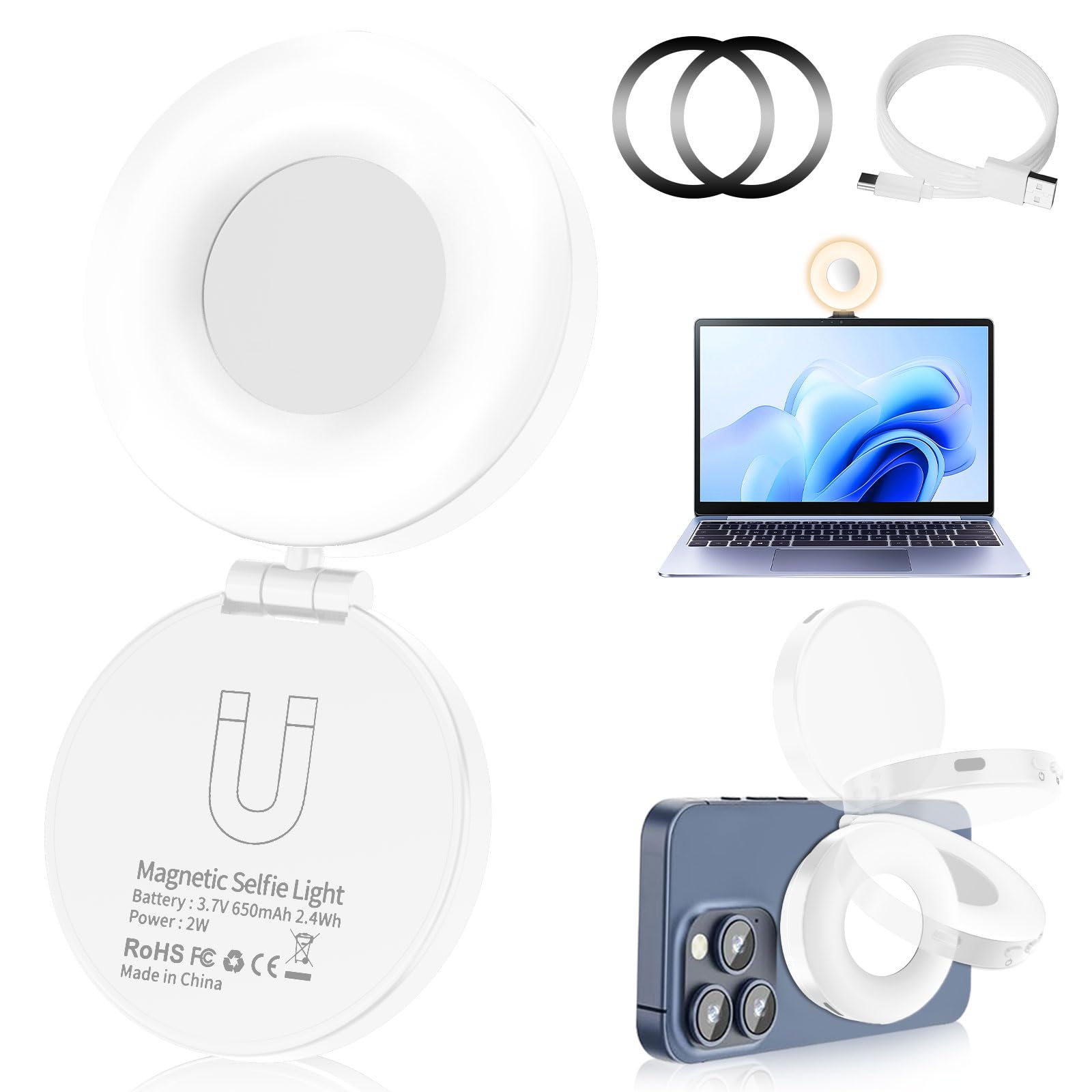 Selfie Light, Selfie Light for iPhone, Portable Phone Ring Light for Video Recording, Adjusted 4 Modes, Rechargeable Fill Light for Selfies, Photography, Makeup, Vlogs, TikTok, Video(White)