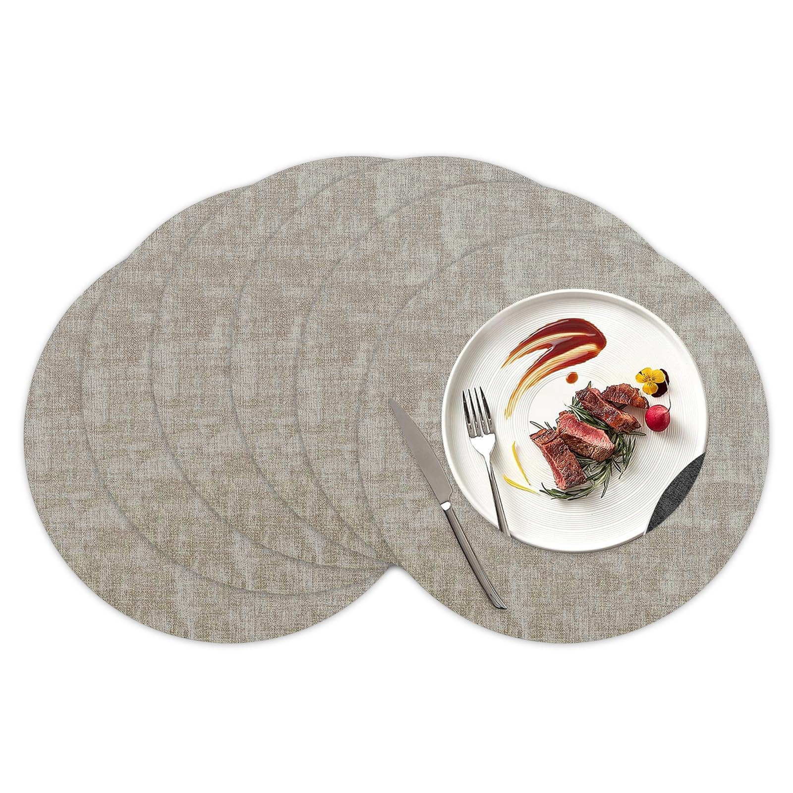 Great deal on 13" Round Placemats Set of 6, Light Grey Dual-Sided Faux Leather Heat Resistant Table Mats, Placemats Set of 6 Washable, Suitable for Dining, Banquets, Family Daily Life at Amazon.