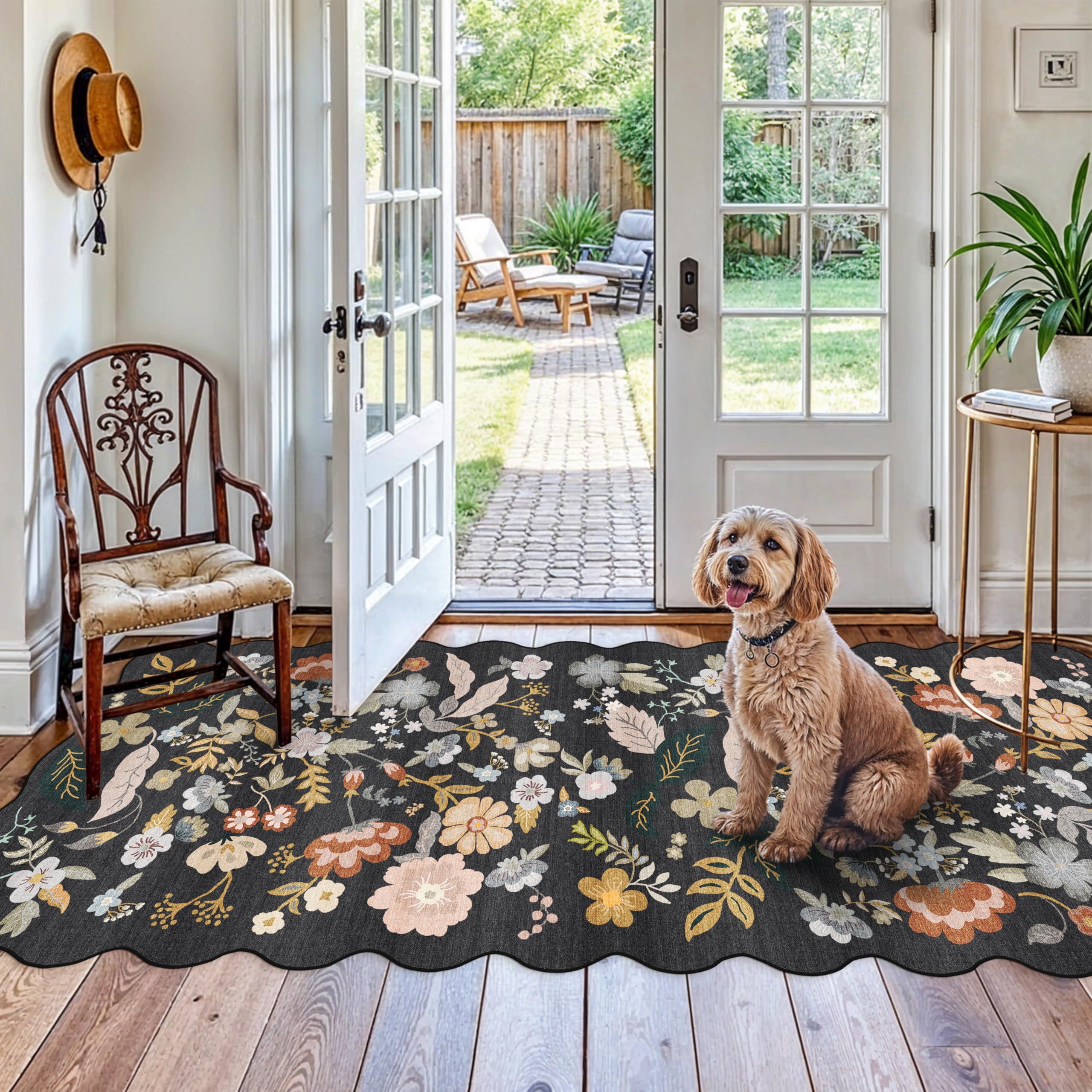4x10 Washable Runner Rug for Hallway: Wide Scalloped Floral Kitchen Rugs Non-Slip Low-Pile Carpet Runner for Bathroom|Living Room|Bedroom Boho Floor Mat for Entryway|Dining Room (Black,4x10)