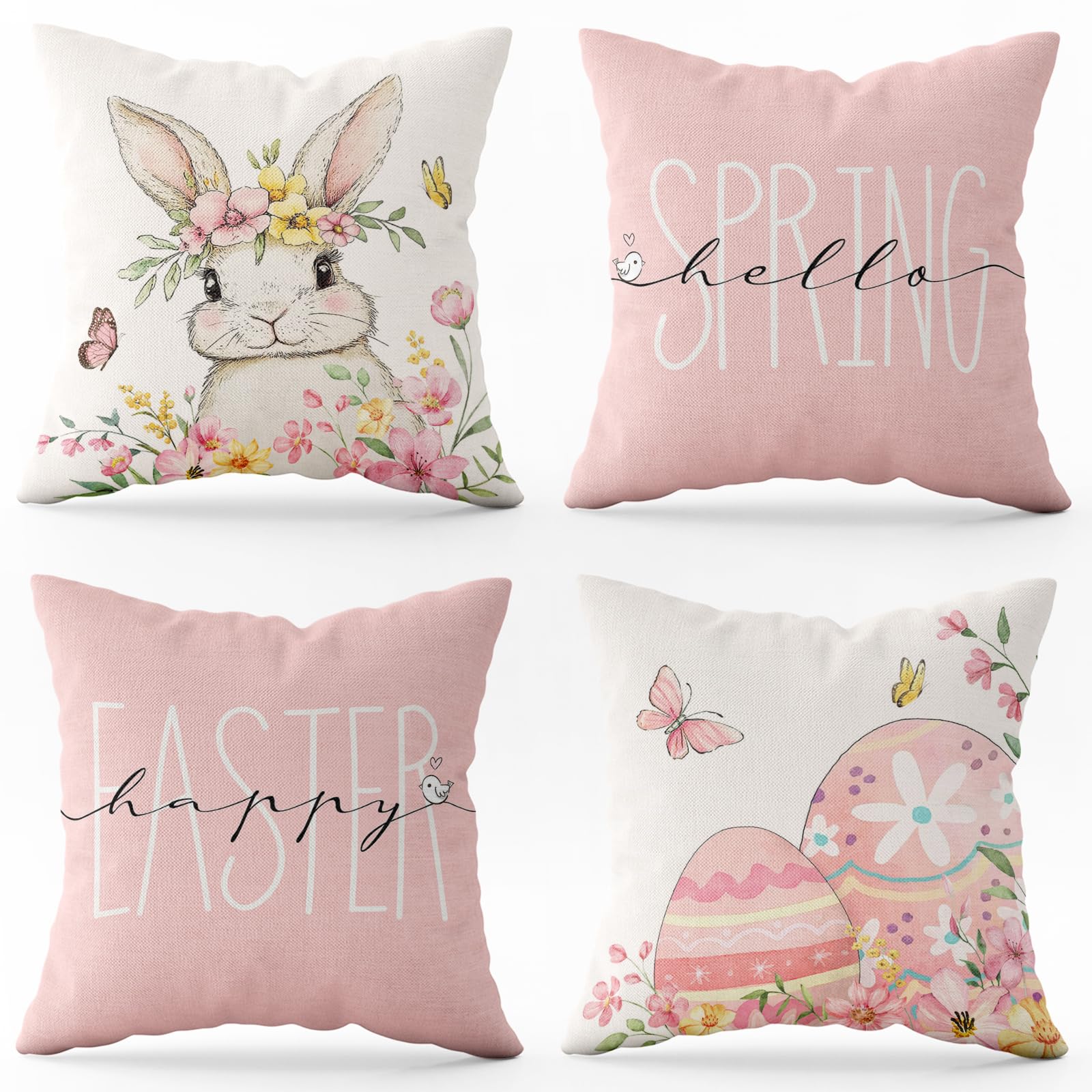 Mocsicka Easter Pillow Covers 18x18 Hello Spring Pink Decorative Throw Pillow Cover Easter Bunny Outdoor Linen Cushion Cases for Farmhouse Sofa Couch Set of 4 (Pink, 18x18 inch)