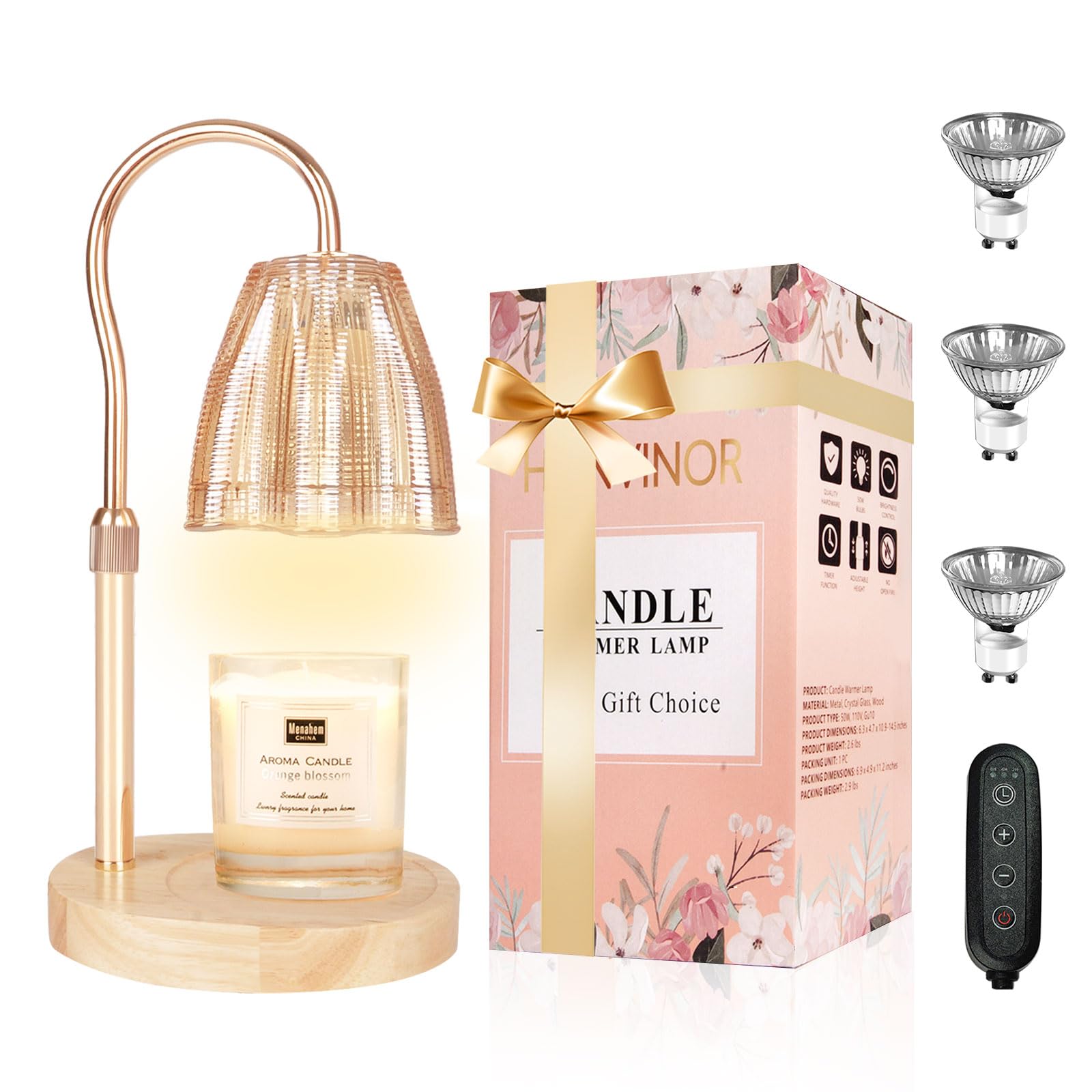 Honvinor Candle Warmer Lamp with Timer & Dimmer, Candle Warmer Height Adjustable, Fits All Jar Scented Candles, Candle Lamp with 3 Bulbs, Charming Gift Box with Ribbon for Gifting
