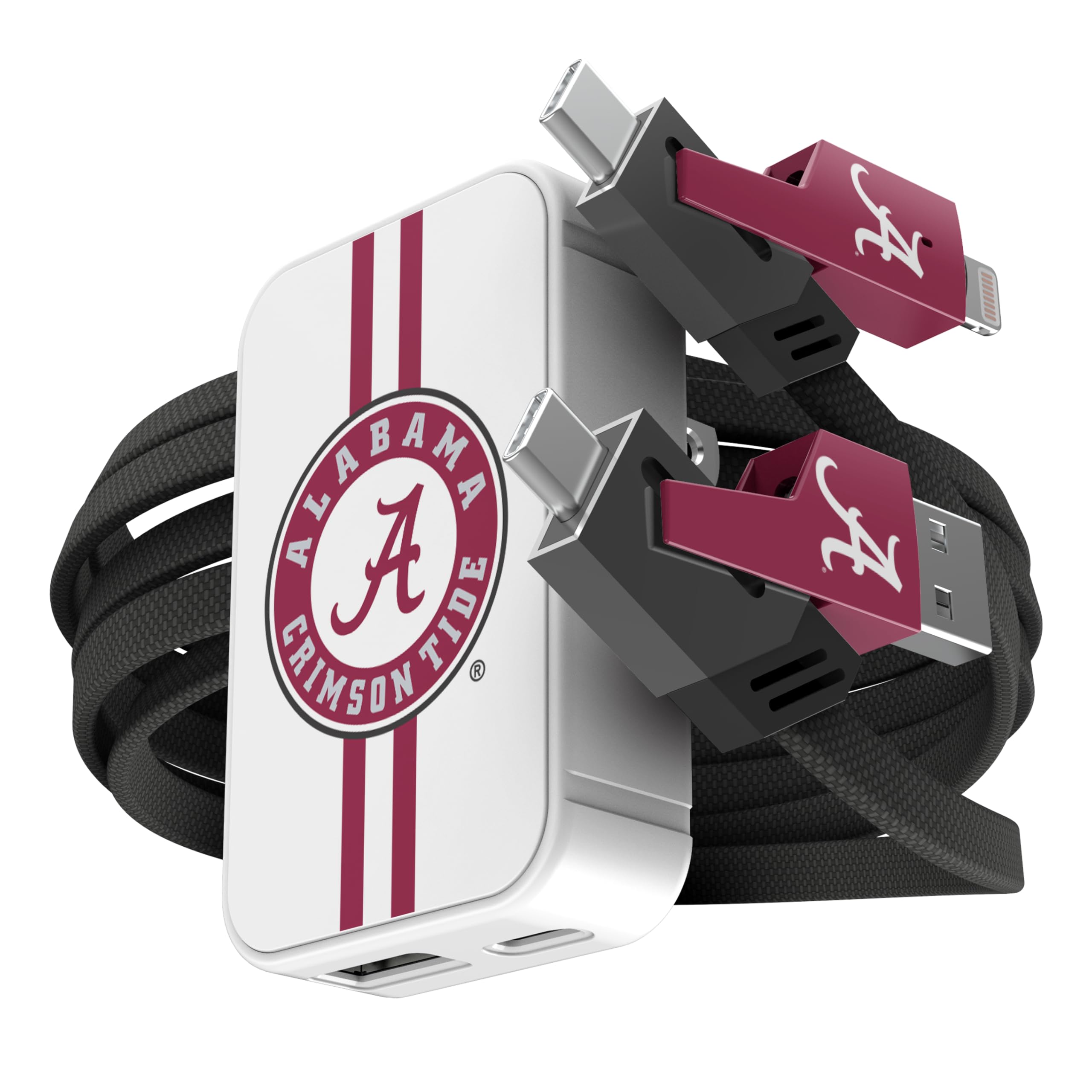 Stay charged and connected with this slim wall charger and 4-in-1 cable set, built for convenience and speed. The 38W dual-port charger (USB-C + USB-A) delivers fast, reliable charging in a compact design that fits tight spaces and folds for easy storage. The flat braided cable offers four connection options—USB-C, USB-A, and Lightning—so you’re always covered, no matter your device. With up to 65W power delivery and high-speed data transfer, this set is perfect for game day travel, tailgates, or everyday use. A must-have for any sports fan who needs to stay charged and connected on the go.