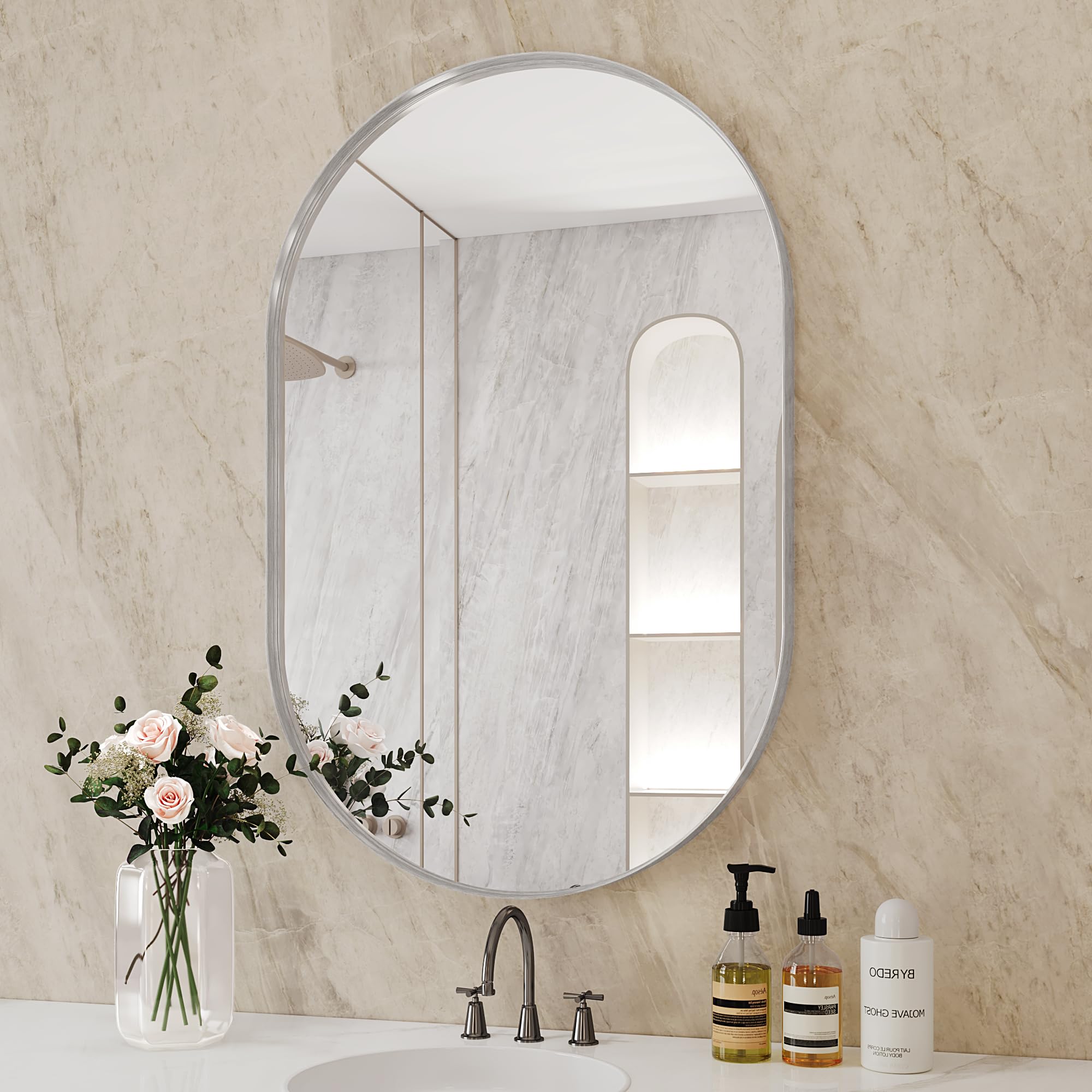 Suidia 26" x 38" Bathroom Mirror, Bathroom Vanity Mirror Metal Framed, Wall-Mounted Mirrors for Bedroom, Living Room, Entryway, Hallway, Silver, Oval Style