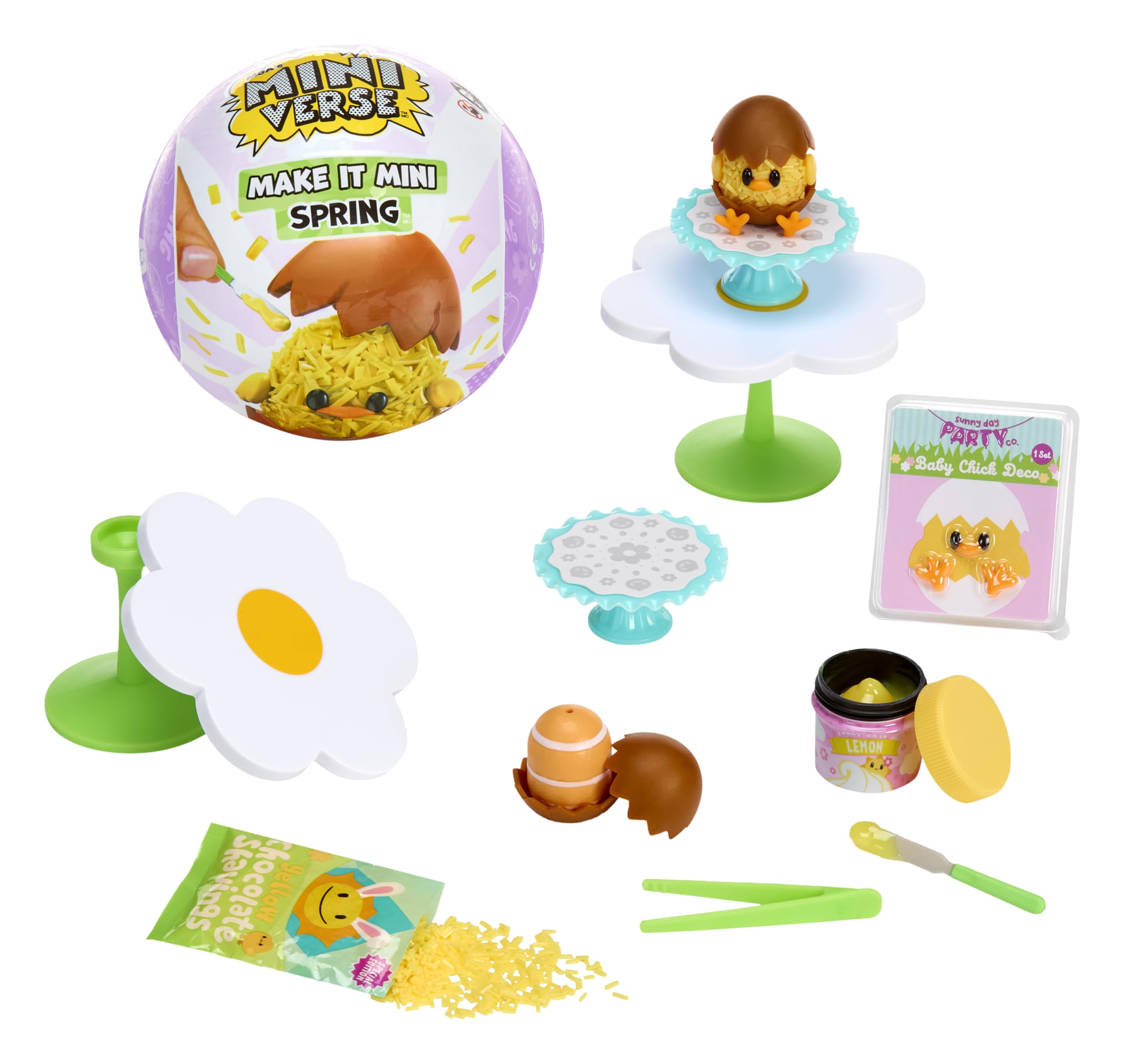 Hop into Spring with the all-new Make It Mini Spring Series! Make, set, display, and collect your way through all new Spring-themed minis that are sure to brighten your day. Crack open each surprise ball and see which Spring mini hops your way! Every unboxing is bursting with seasonal fun, and there are four adorable minis to collect in this series! Check your collector’s guide to discover which mini bloomed in your pack. Follow the “recipe” card to craft your Spring masterpiece. After assembling your tiny treat, set it under the sun or place it under a UV light until the resin sets. Once hardened, your mini is ready to show off. Display your mini proudly on an exclusive Spring mini table—found only in these egg-cellent Spring packs. Keep your eyes peeled for the Ultra Rare Bird’s Nest Treats. DISCLAIMER: ALL INGREDIENTS ARE NOT EDIBLE AND DO INCLUDE RESIN PLAY. NOT SUITABLE FOR KIDS UNDER 8 YEARS OF AGE.