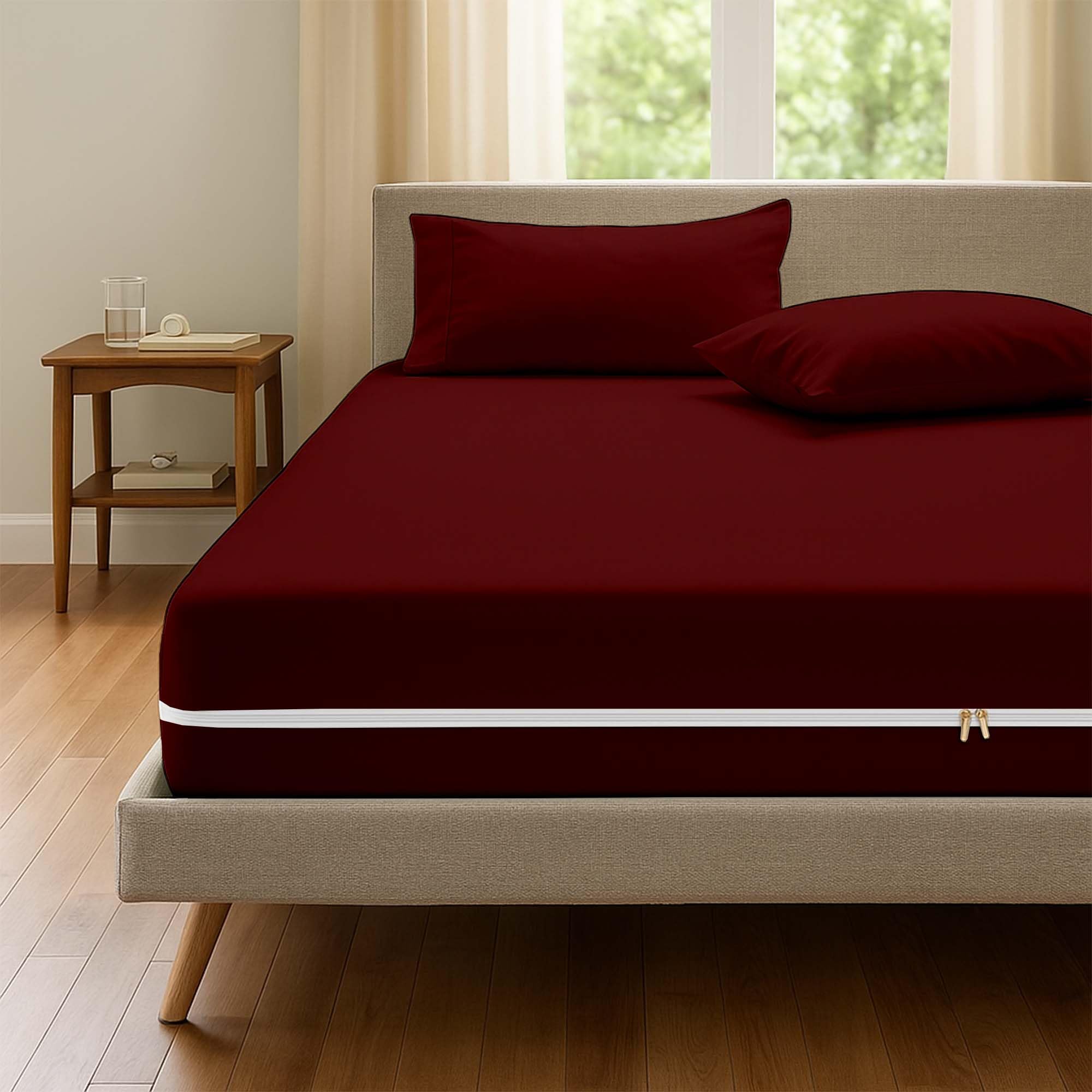 Zipper Fitted Bottom Sheet Twin-15 Inch Deep Pocket, 1800 TC Microfiber, Wrinkle-Free, Breathable & Secure Fit Fitted Style Mattress Cover Burgundy Solid