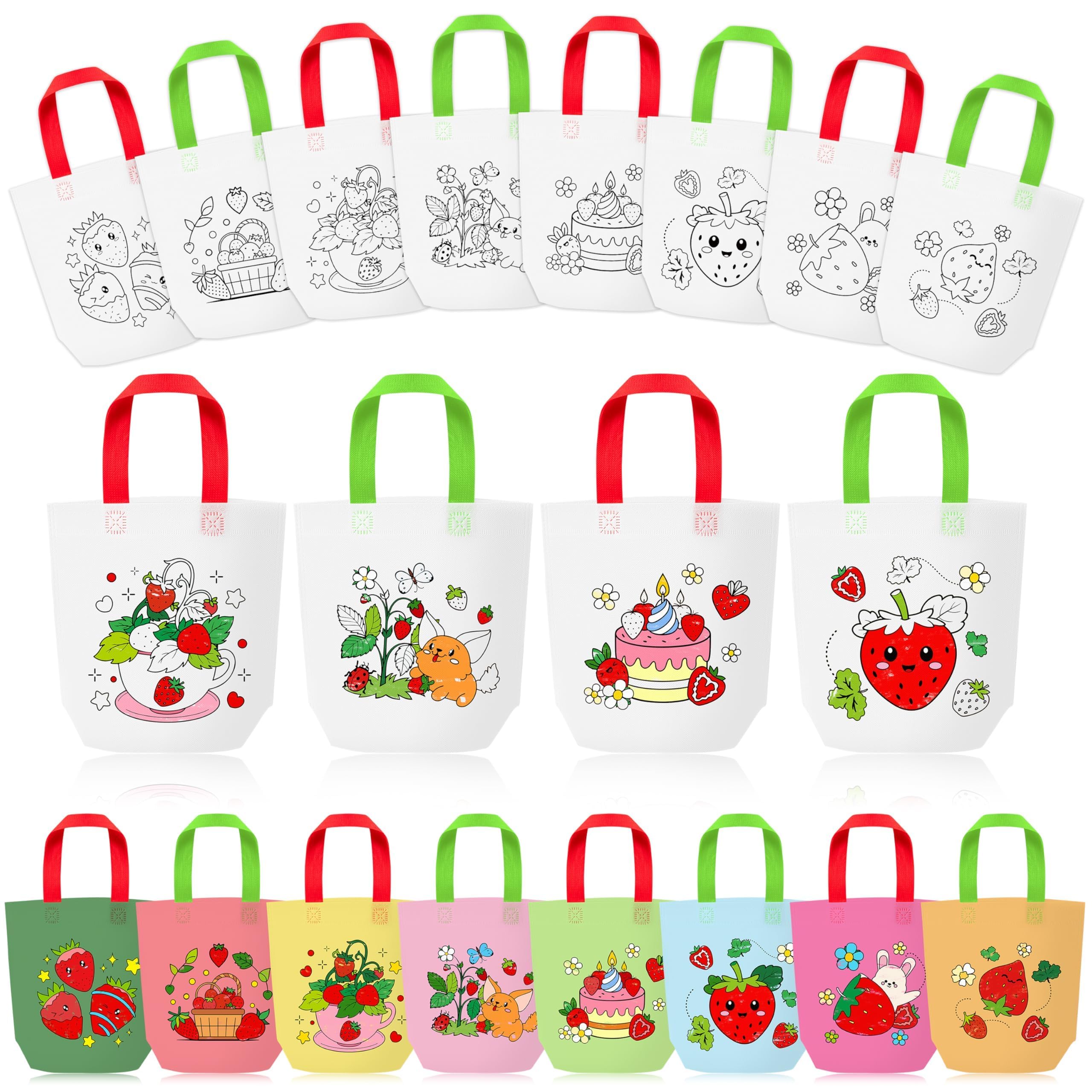 Strawberry Coloring Goodie Bags for Kids - 24Pcs Valentine's Day Strawberry Bulk Color Your Own Gift Bags with Handle FruitsTheme Reusable Coloring Bag Non Woven Tote Bag for DIY Crafts Party Favors