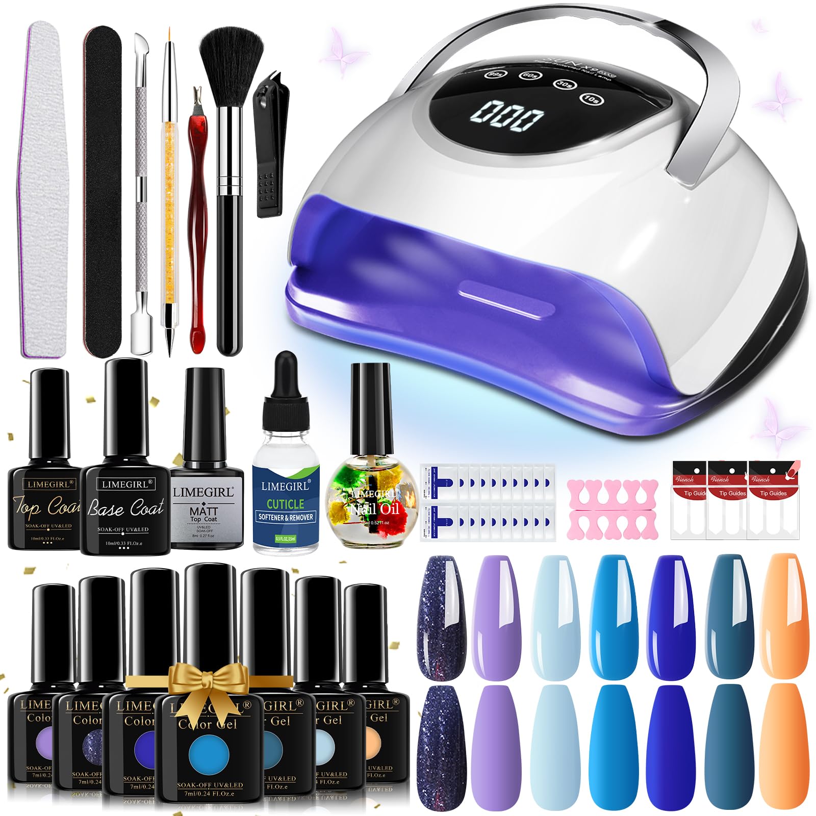 LimeGirl Gel Nail Polish Kit with U V Light, 23PCS Starter Kit with 7 Colors, Royal Blue/Glitter Navy Blue/Purple/Sunset Orange Seaside Color Collection, Salon-Grade LED Nail Lamp & Gel Polish Set