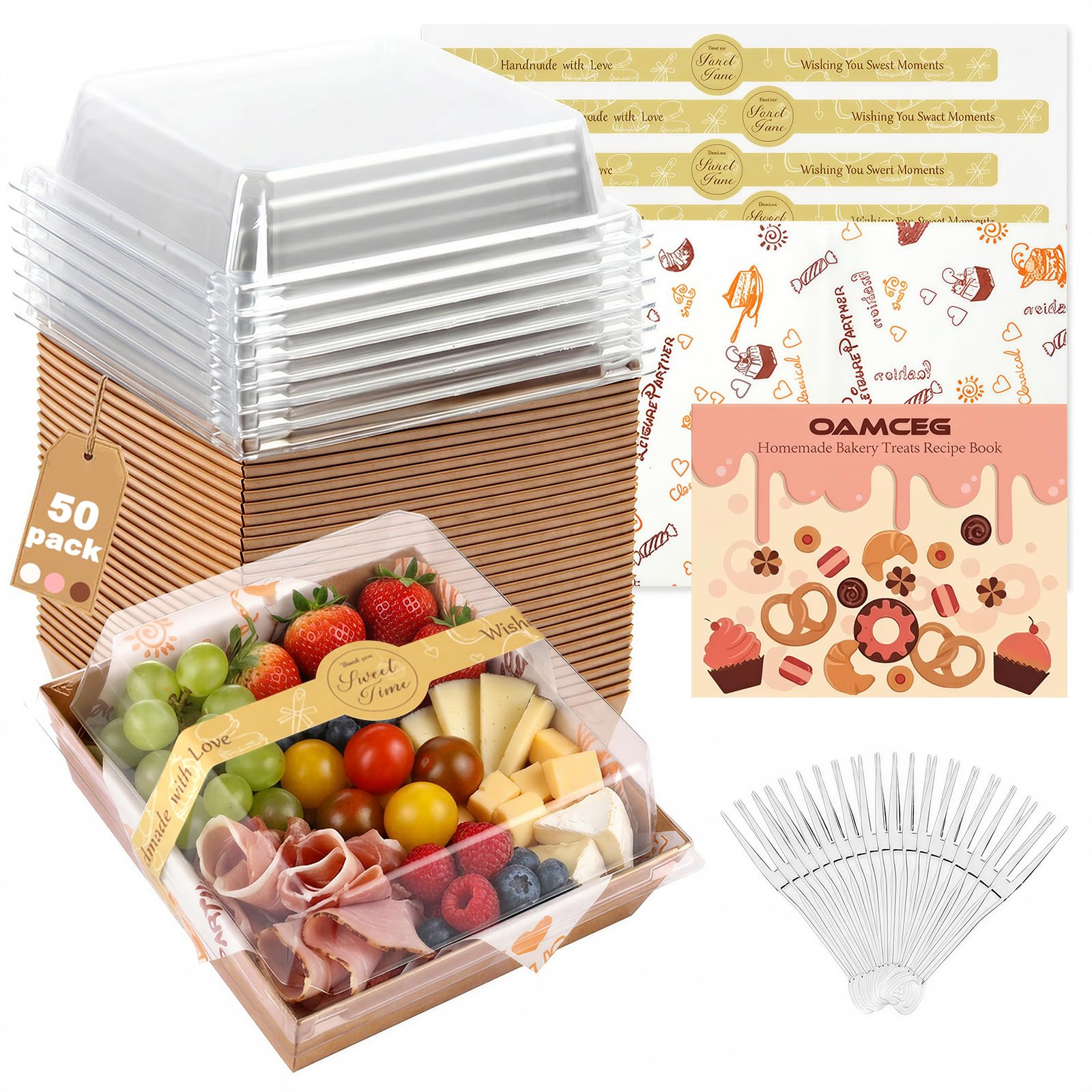 Upgrade your food presentation with these 5.3-inch small charcuterie boxes with clear lids. Made from premium food-grade cardboard and PET plastic, they’re No-BPA, recyclable, sturdy, and perfect for desserts, sandwiches, sushi, or salads. The crystal-clear lids beautifully showcase your treats while keeping them safe and fresh. A grease-proof inner coating prevents oils and sauces from soaking through, ensuring your packaging stays clean and no-mess. These ready-to-use to-go food containers require no assembly and are lightweight, stackable, and convenient for transport. Ideal for bakeries, weddings, parties, picnics, birthdays, and catering events, they add a professional and elegant touch to every occasion. Each set includes bonus accessories— stickers, pad paper, and mini forks—making it a complete and thoughtful packaging solution. Choose from 30, 50, or 100 packs to suit any event, from small gatherings to large celebrations. Stylish, sturdy, and sustainable, these clear-lid bakery boxes make your food packaging as memorable as the flavors inside.
