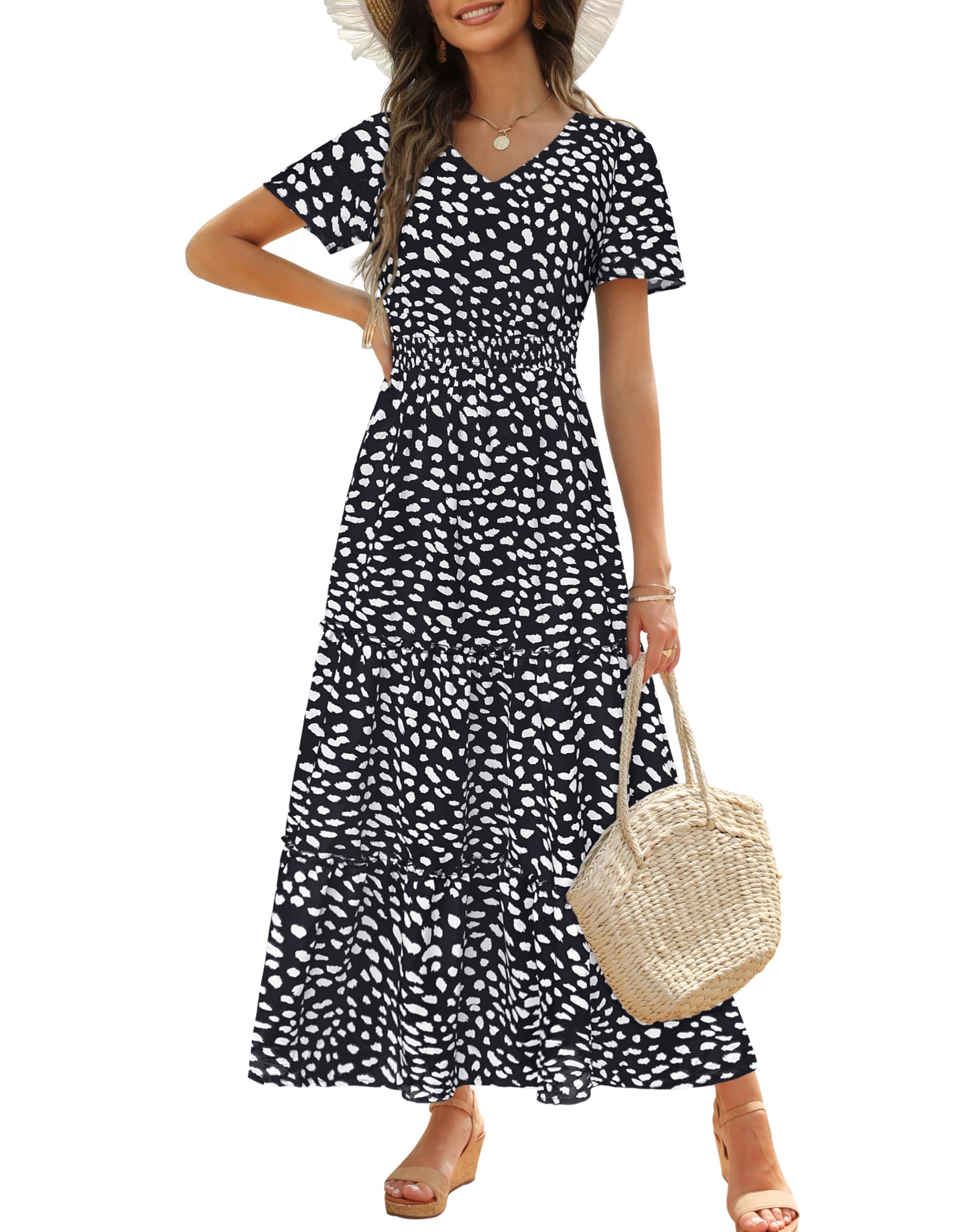 Zattcas Womens 2026 Long Summer Dress Short Flutter Sleeve V Neck Casual Smocked Tiered Modest Floral Boho Maxi Dress