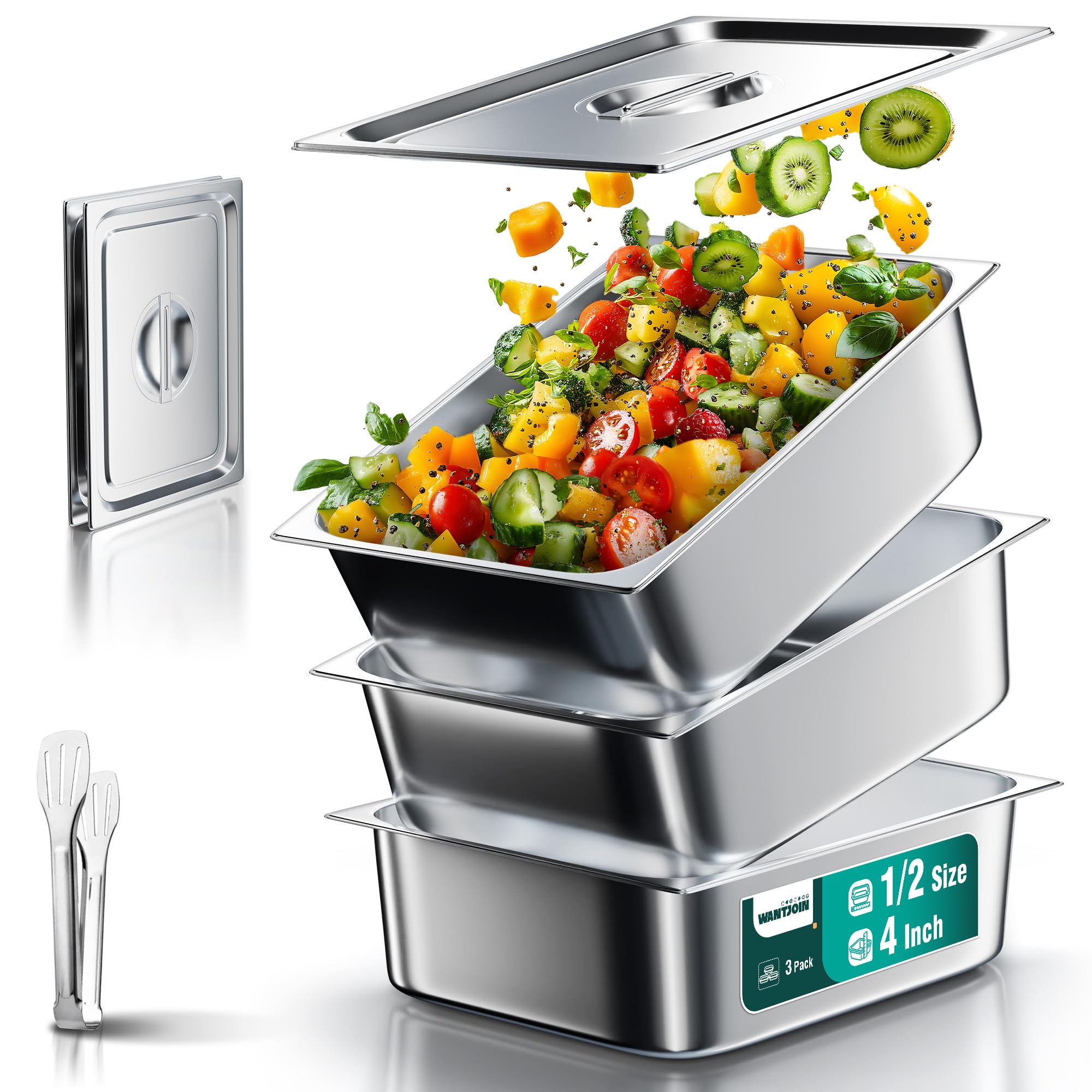 WantJoin Steam Table Hotel Pans with Lid 1/2 Half Size 4 Inch Deep 3 Pack, Thickened Stainless Steel Metal Tray Sets Food Storage Container, Restaurant Chafing Dishes Commercial Buffet Warmer Catering
