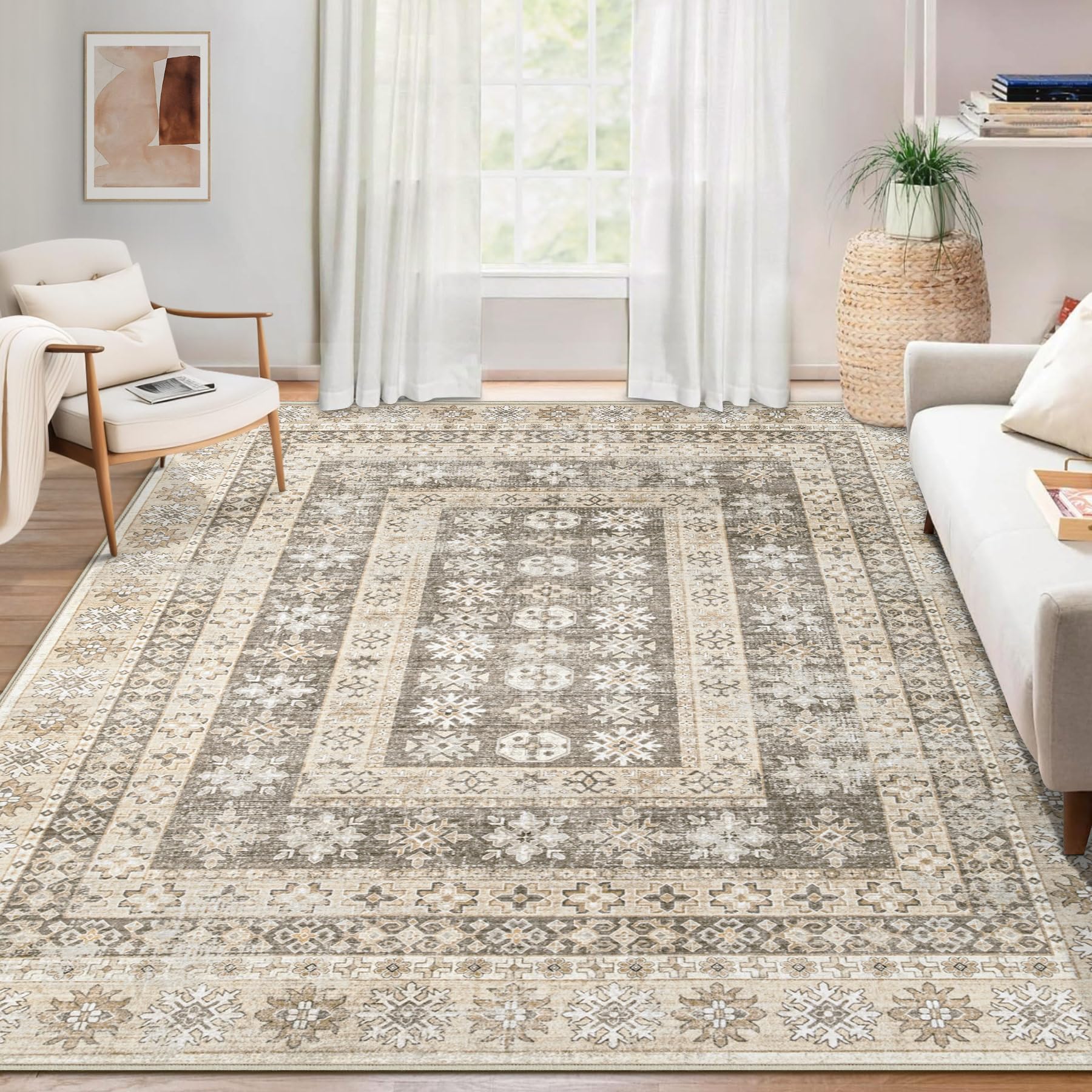 Area Rug for Living Room 6x9: Large Washable Boho Moroccan Rugs Geometric Floral Rug, Non-Slip Foldable Morden Farmhouse Indoor Floor Carpet for Bedroom Dining Table Home(FloralBrown, 6'x9')