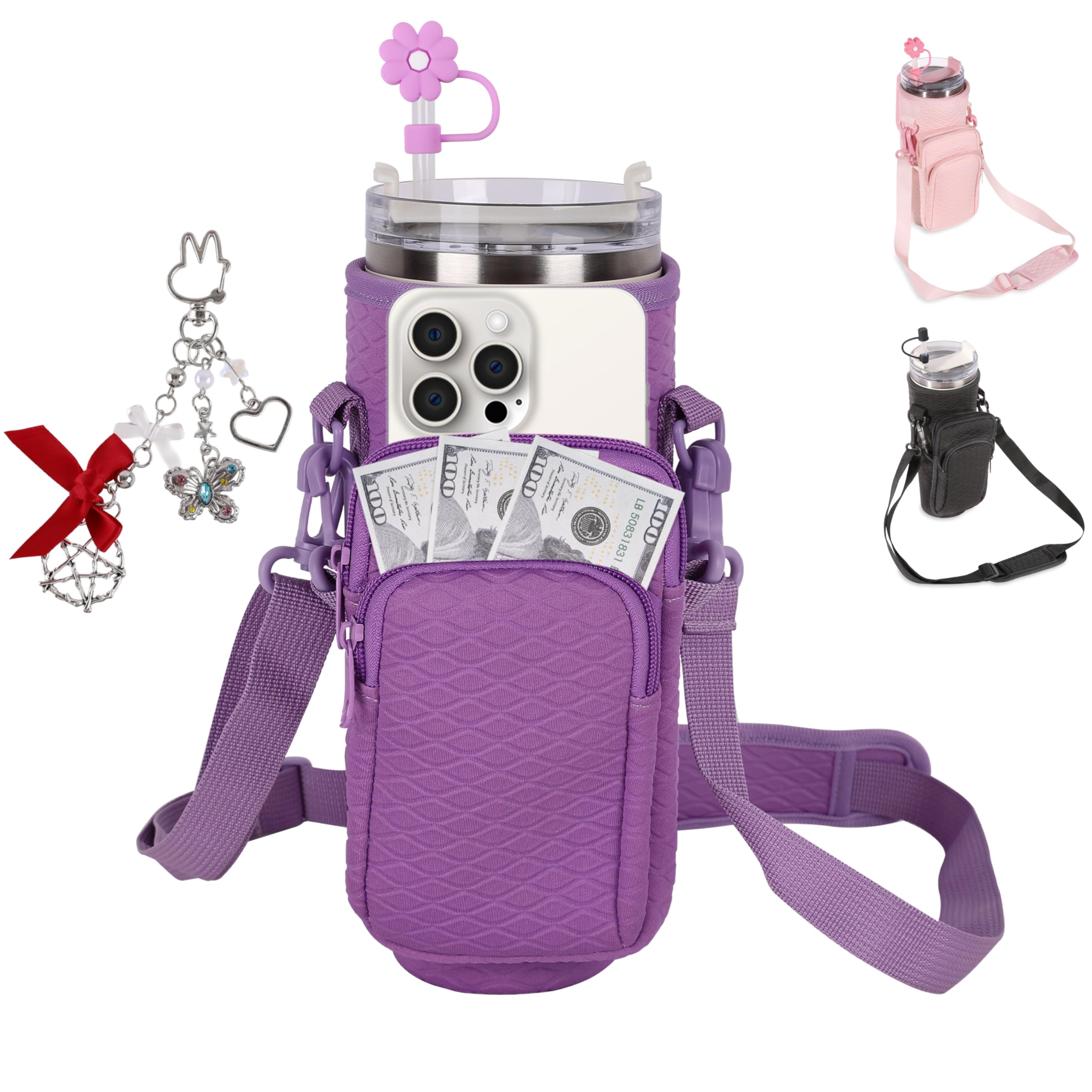 &And Per Se Water Bottle Shoulder Bag for Women, Neoprene Carrier with Phone Pocket & Purple Charm, Adjustable Crossbody Strap Fits Stanley 40oz Tumblers, Gift for Her (Purple)