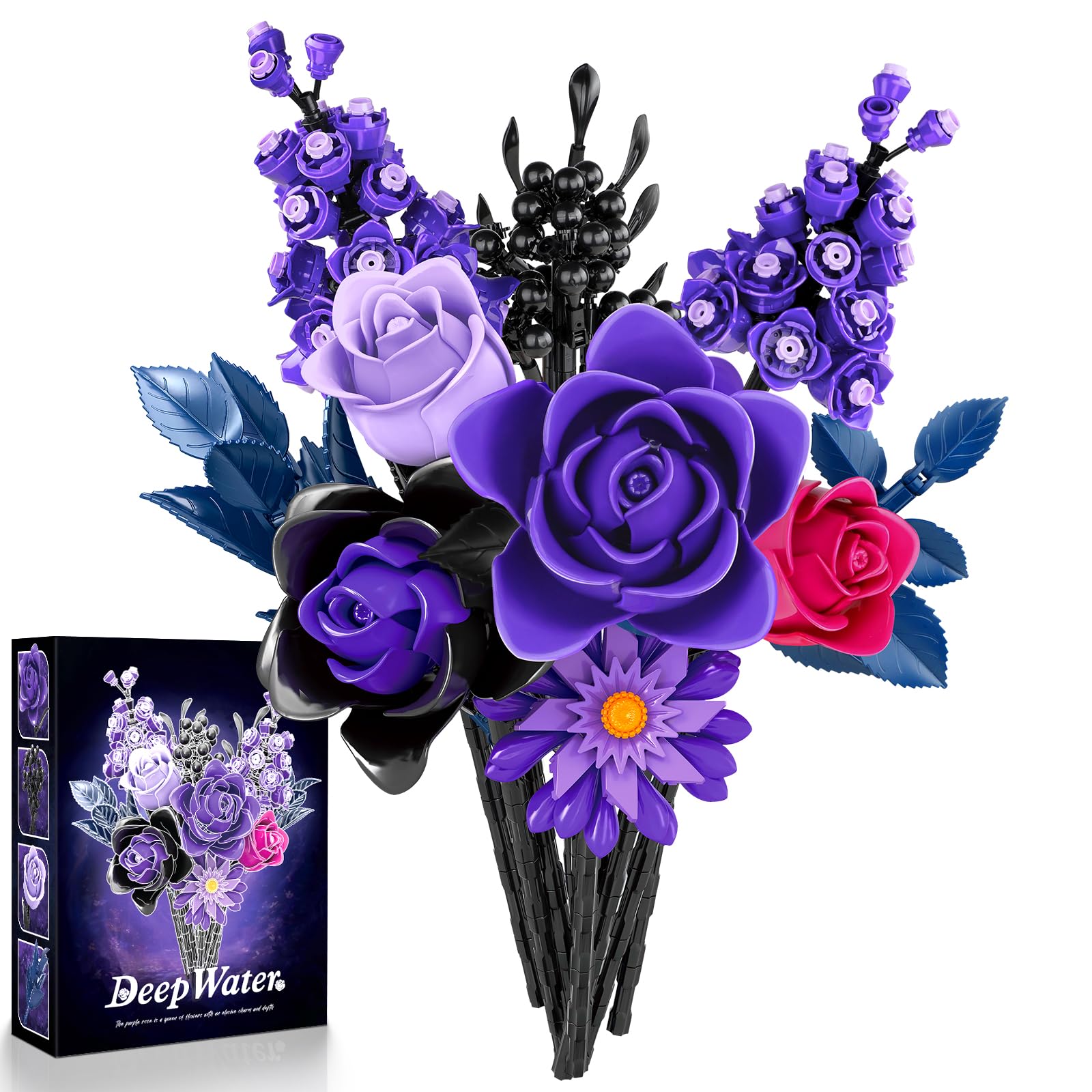 Halloween Decorations Indoor Purple Roses Building Blocks Kit for Adults & Teens – DIY Flower Bouquet Building Set, Artificial Flowers Gift for Women, Gothic Home Decor for Valentine’s Day