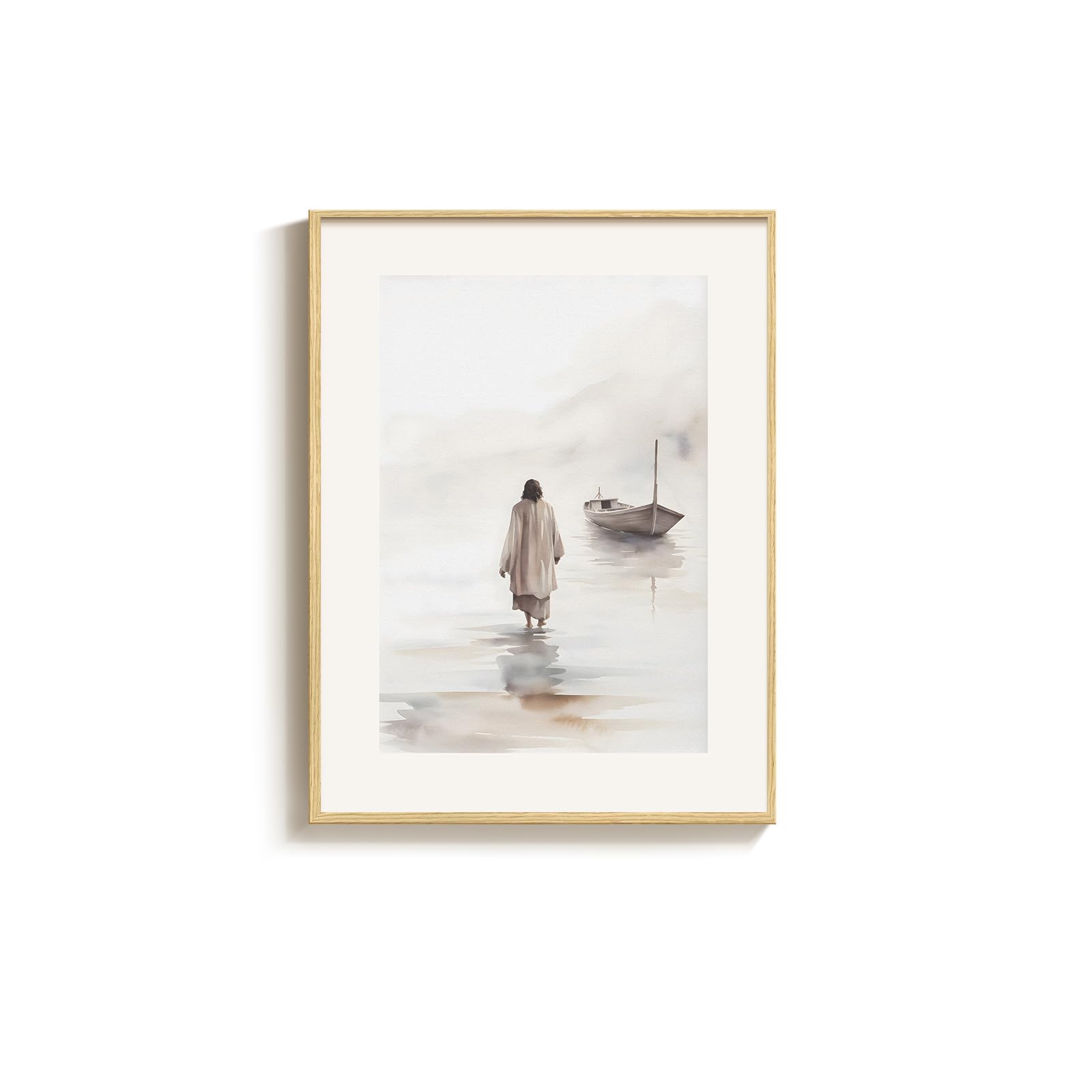 Framed Christian Wall Art, Jesus Walking on Water Canvas Print, Minimalist Neutral Beige Watercolor Biblical Artwork for Living Room Bedroom Prayer Room, 12x16 Inch