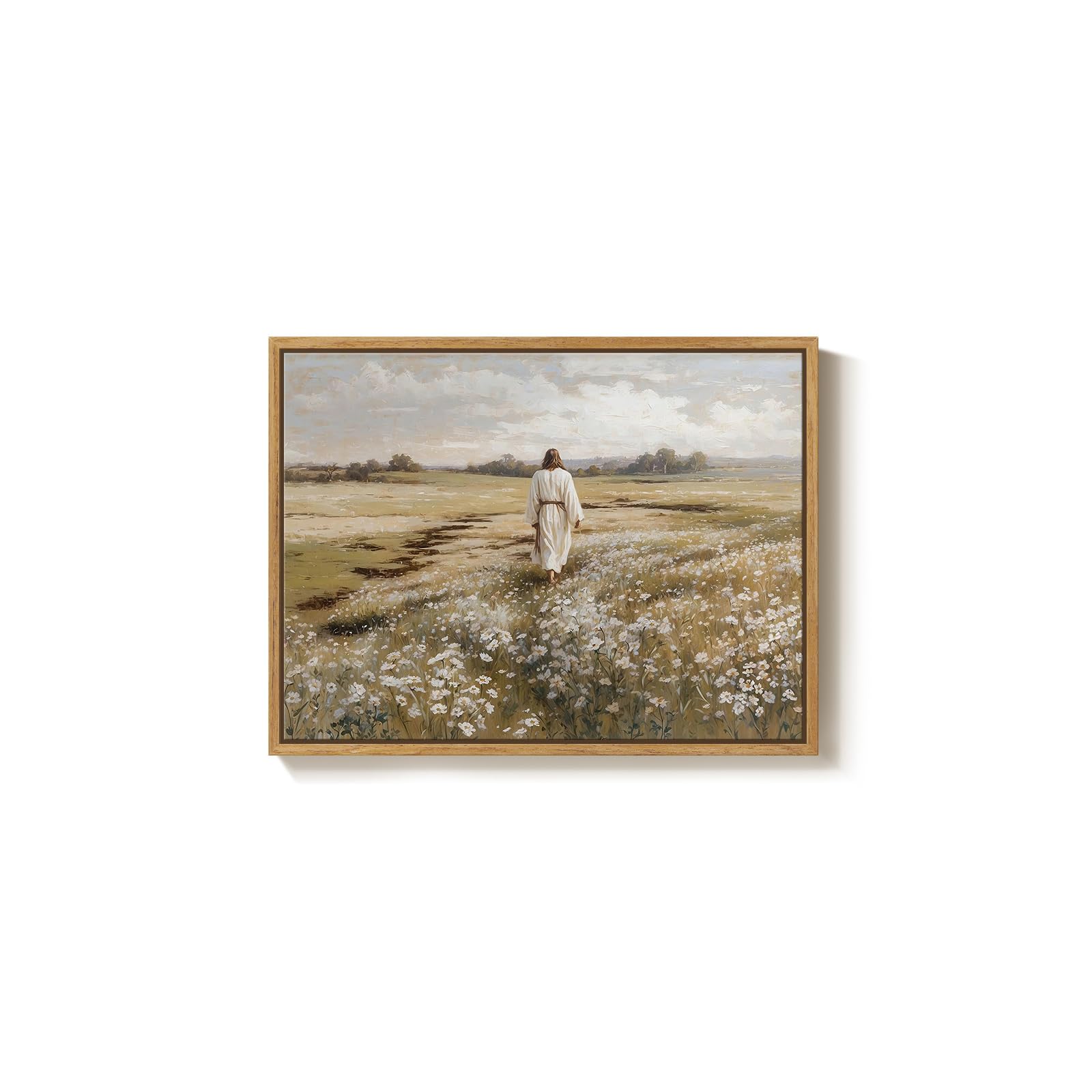 Framed Vintage Christian Wall Art, Jesus Walking in Field Canvas Print, Rustic Floral Landscape Biblical Wall Decor for Living Room Bedroom Prayer Room, 12x16 Inch
