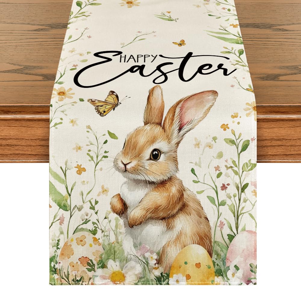 Artoid Mode Bunny Rabbit Butterfly Eggs Flowers Easter Table Runner, Seasonal Spring Kitchen Dining Table Decoration for Home Party Decor 13x72 Inch
