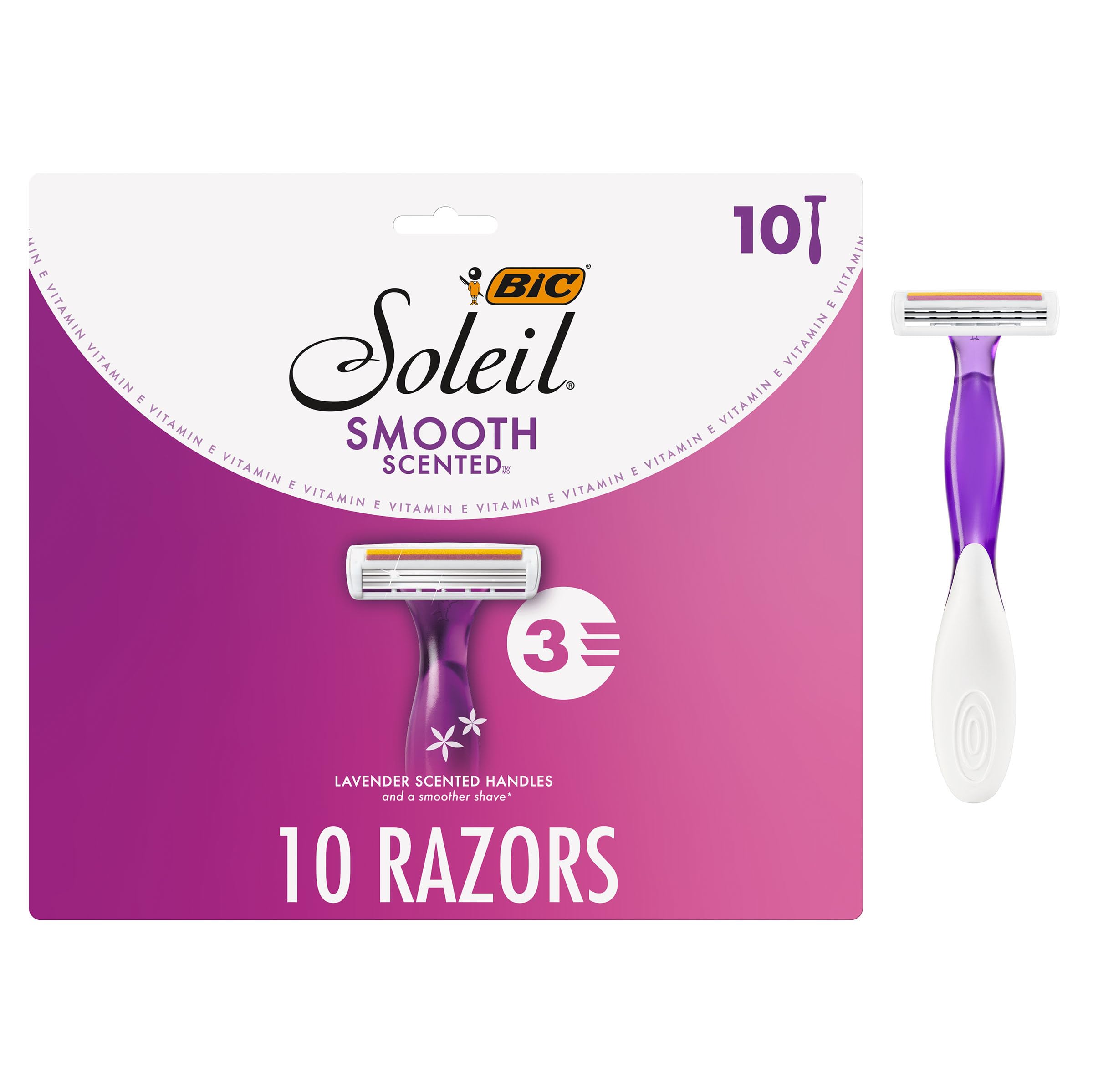 BIC Soleil 3 Scented Women's Disposable 3-Blade Razors, Calming Lavender Scent and Vitamin E Moisture Strip, 10-Pack