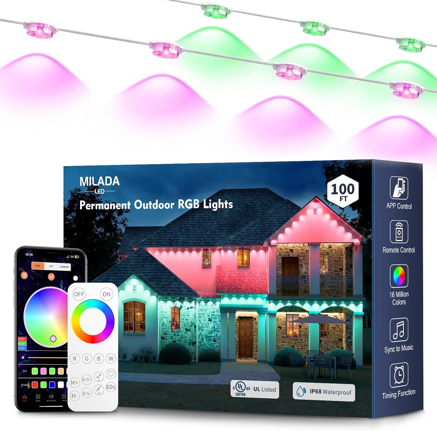 MILADALED Permanent Outdoor Lights RGB 100FT/50LEDs Decor IP68 Waterproof Music Sync Eaves Lights with Remote&APP Control Suitable for Holiday Decoration Christmas Garden Party Decor Deck