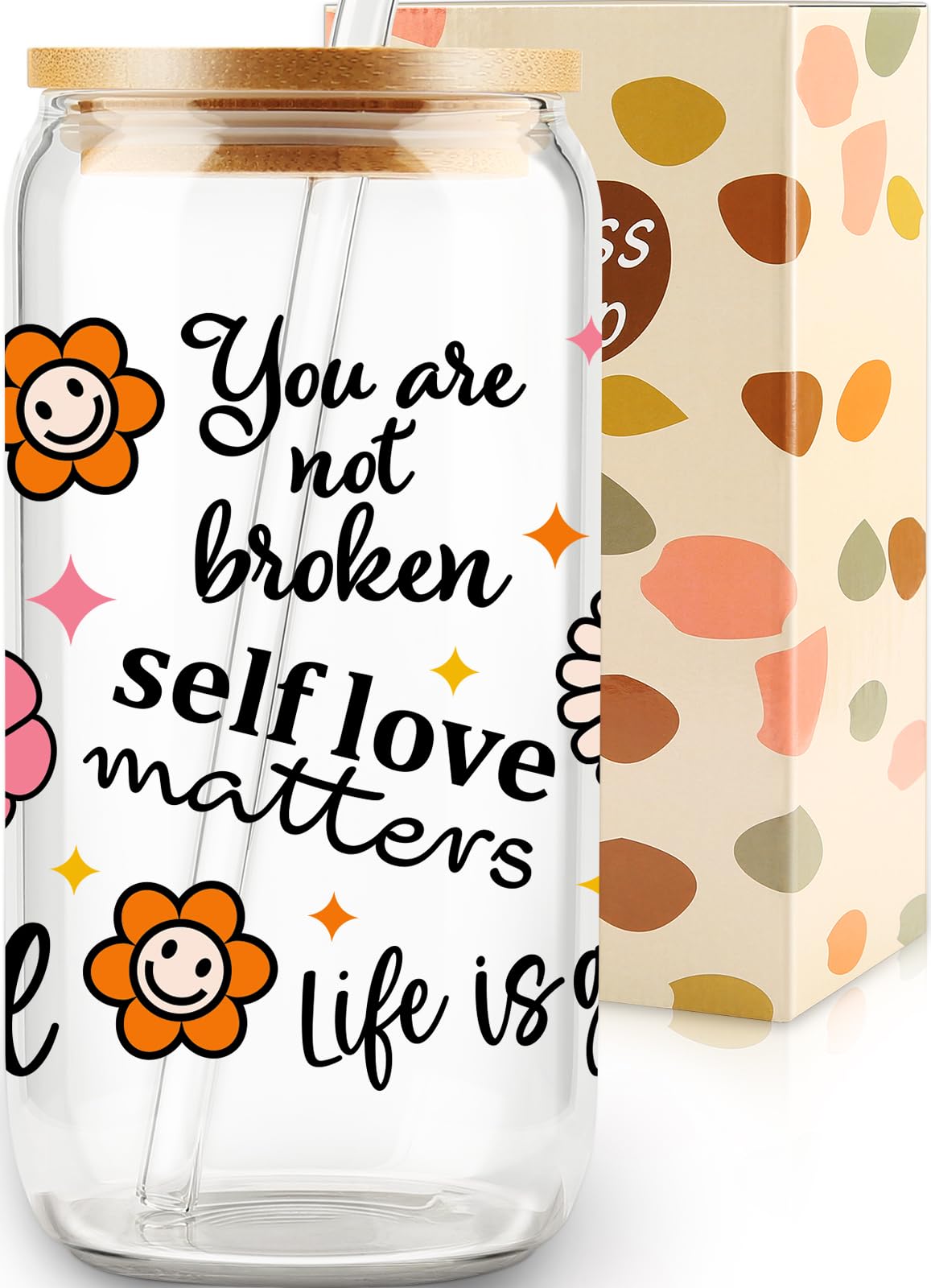 VIISPIRIT Self Love Matters, Mental Health Sublimation Glass Tumbler, 16oz Glass Can Cup with Positive Quotes and Smiley Flowers, Gift for Her Best Friend Tumbler, Self Care Gift, Lid and Straw