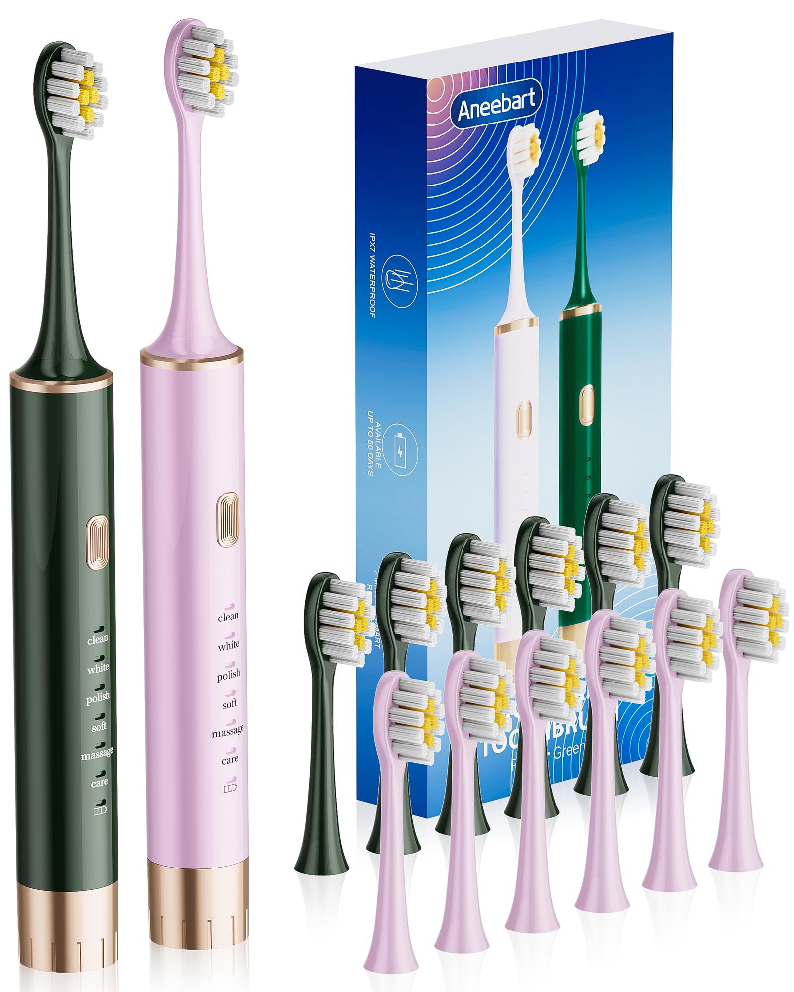 Aneebart Sonic 2 Pack Electric Toothbrush for Adults and Kids, Travel Toothbrush Includes 12 Replacement Toothbrush Heads, 6 Modes with 2 MIN Smart Timer (Purple, Green)