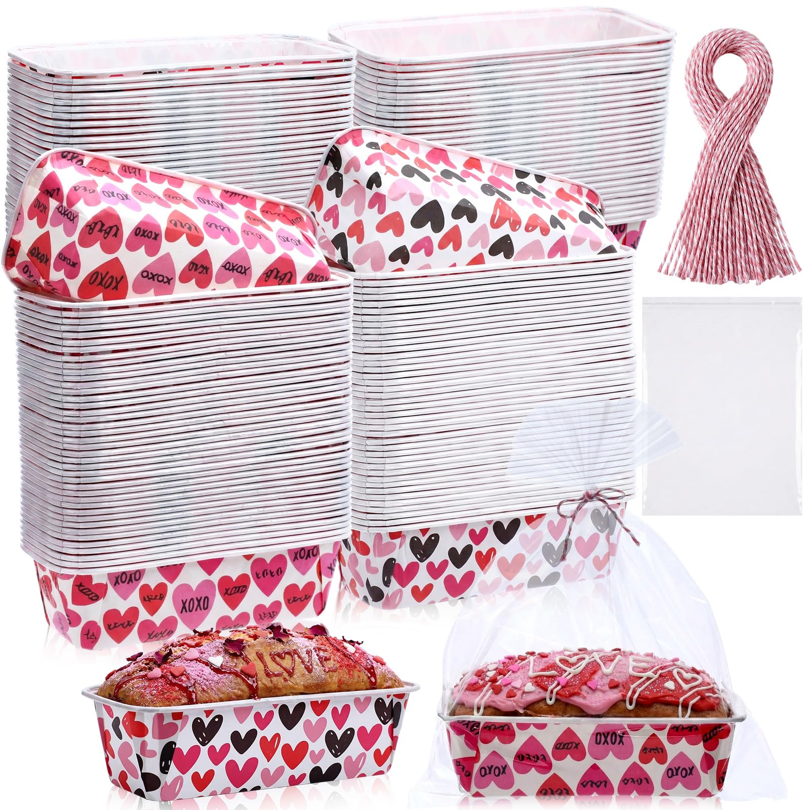 Features: Our Valentine's Day paper loaf pans, printed with pink, red and black hearts, capture the romantic holiday atmosphere and add a playful touch of decoration to your kitchen or dining table. These loaf pans are easy to use and make baking a breeze. These mini loaf pans with bread bags make for a sweet gift for loved ones, friends, family, and other baking enthusiasts—a gift they're sure to love. Specifications: Material: paper, plastic Color: pink, red and black Size: about 6.1 x 2.1 x 2.1 Inch/155 x 54 x 53 mm Package includes: 100 x Paper loaf pans 100 x Clear plastic bags 100 x Ties Notes: Manual measurement, please allow slight errors on size. The color may exist a slight difference due to different screen displays