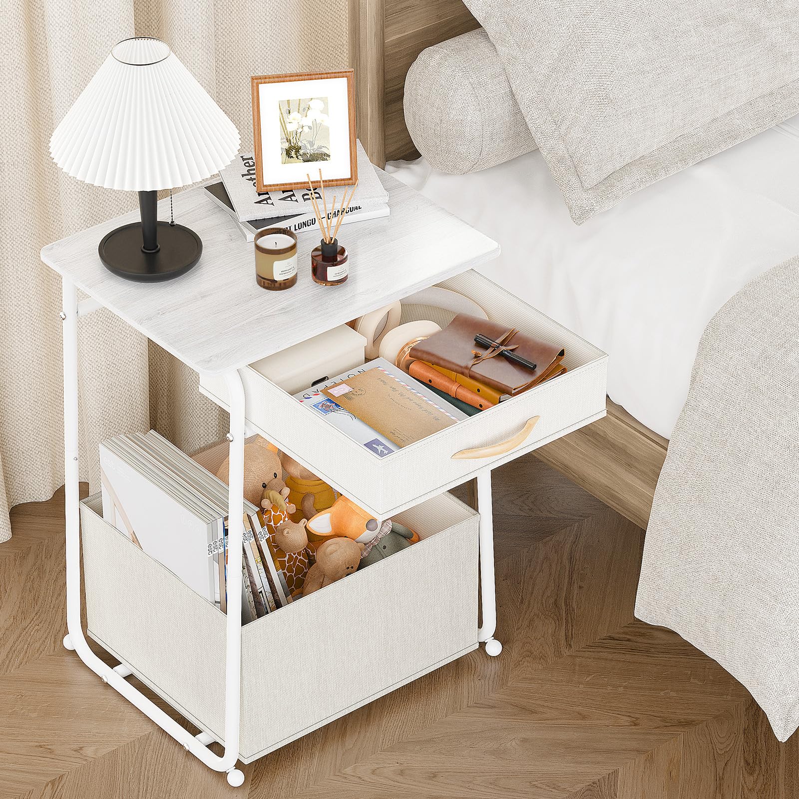 Olldide 3-Tier Bedside Table with Storage, Modern Square Nightstand with Fabric Storage Basket & Drawers, Multifunctional Side Table for Living Room, Bedroom (White)