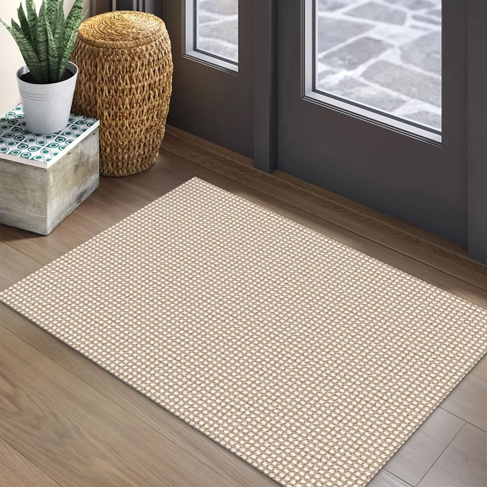 EARTHALL Woven Area Rug 2x3 Ft Washable Rugs for Entryway Braided Non Slip Throw Rugs Door Mat Indoor Outdoor Entrance Small Cotton Woven Carpet for Kitchen Foyer Front Door, Beige/Khaki