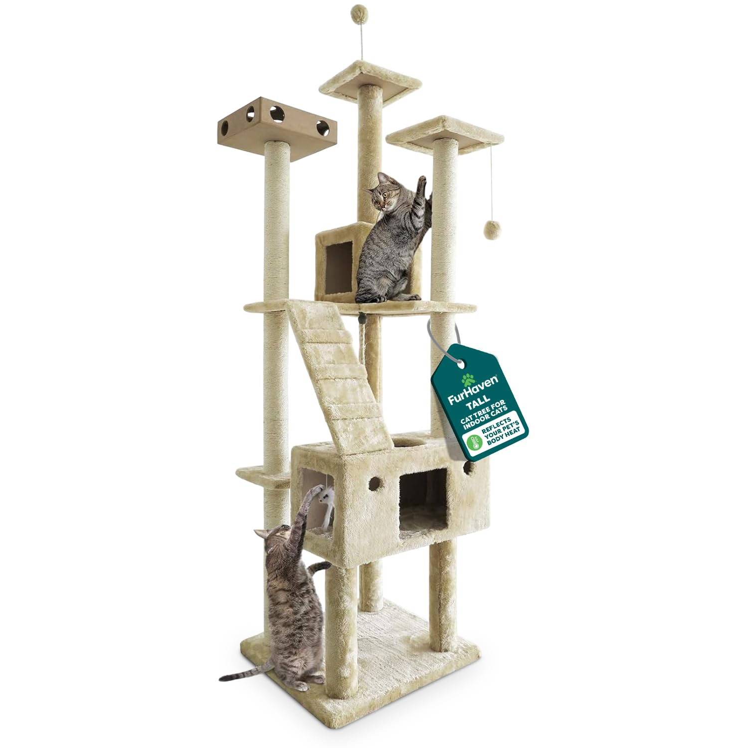 FurHaven 69.3" Tall Cat Scratching Post Tower for Indoor Cats, Sisal Cat Tree with 2 Condos, Tiger Tough Double Decker Playground, Toys & Perches for Cats, Sisal, Cream